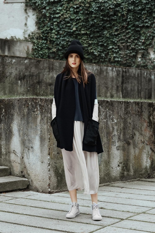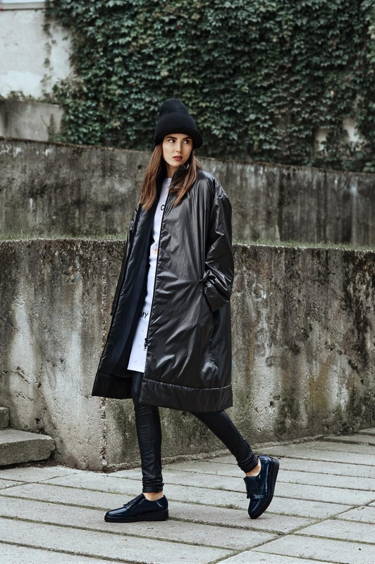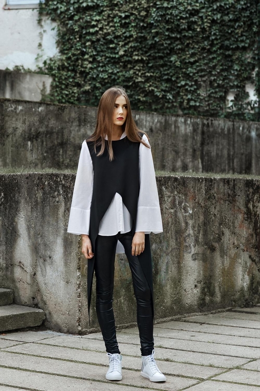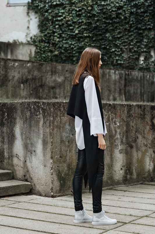 Kasdieniam įvaizdžiui sukurti derinamos odinės tamprės, balti marškiniai ir įdomaus kirpimo palaidinė. Šis įvaizdis derinamas su sportinio stiliaus bateliais.