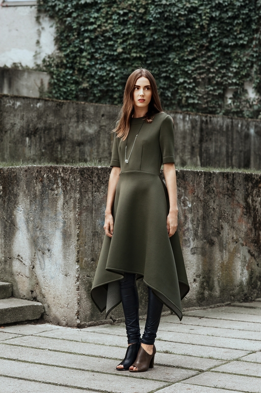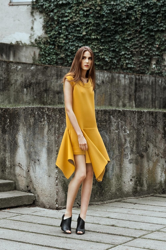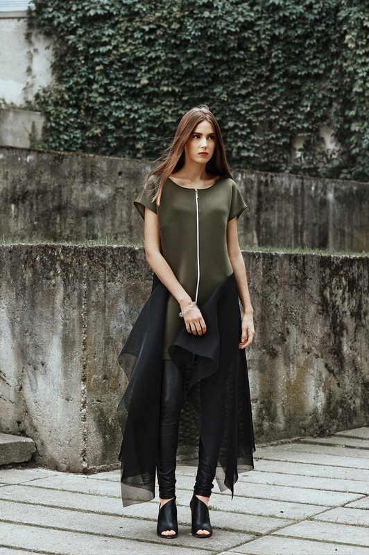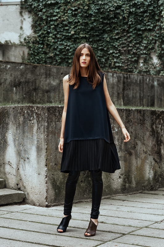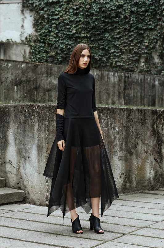 Nemažai drabužių siūloma vakaro aprangai. Aštraus kirpimo suknelės, tiek vientiso audinio, tiek derintos su perregimu audiniu, skirtos laisvalaikiui bei vakarui.