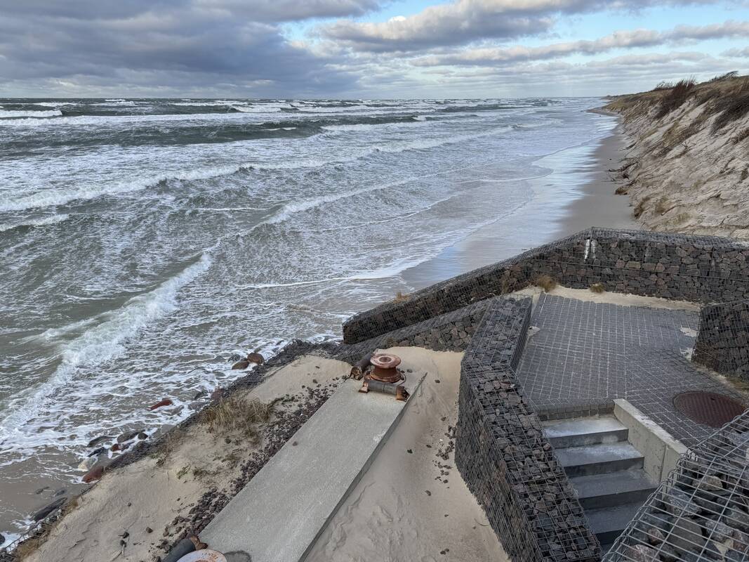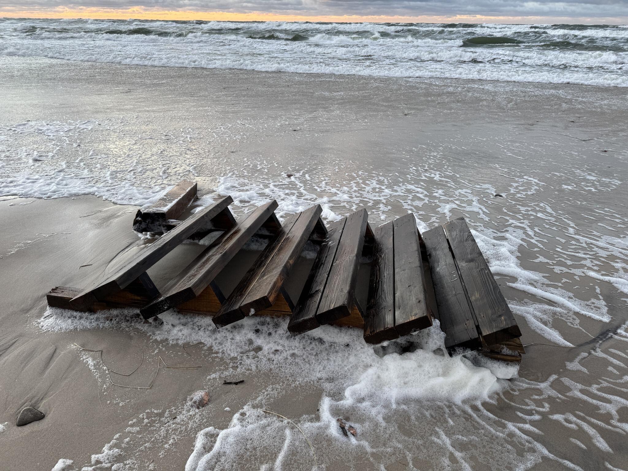 Vienas padarinių – audros sulaužyti laiptai. Jų „likučius“ bangos lengvai neša kelis kilometrus.