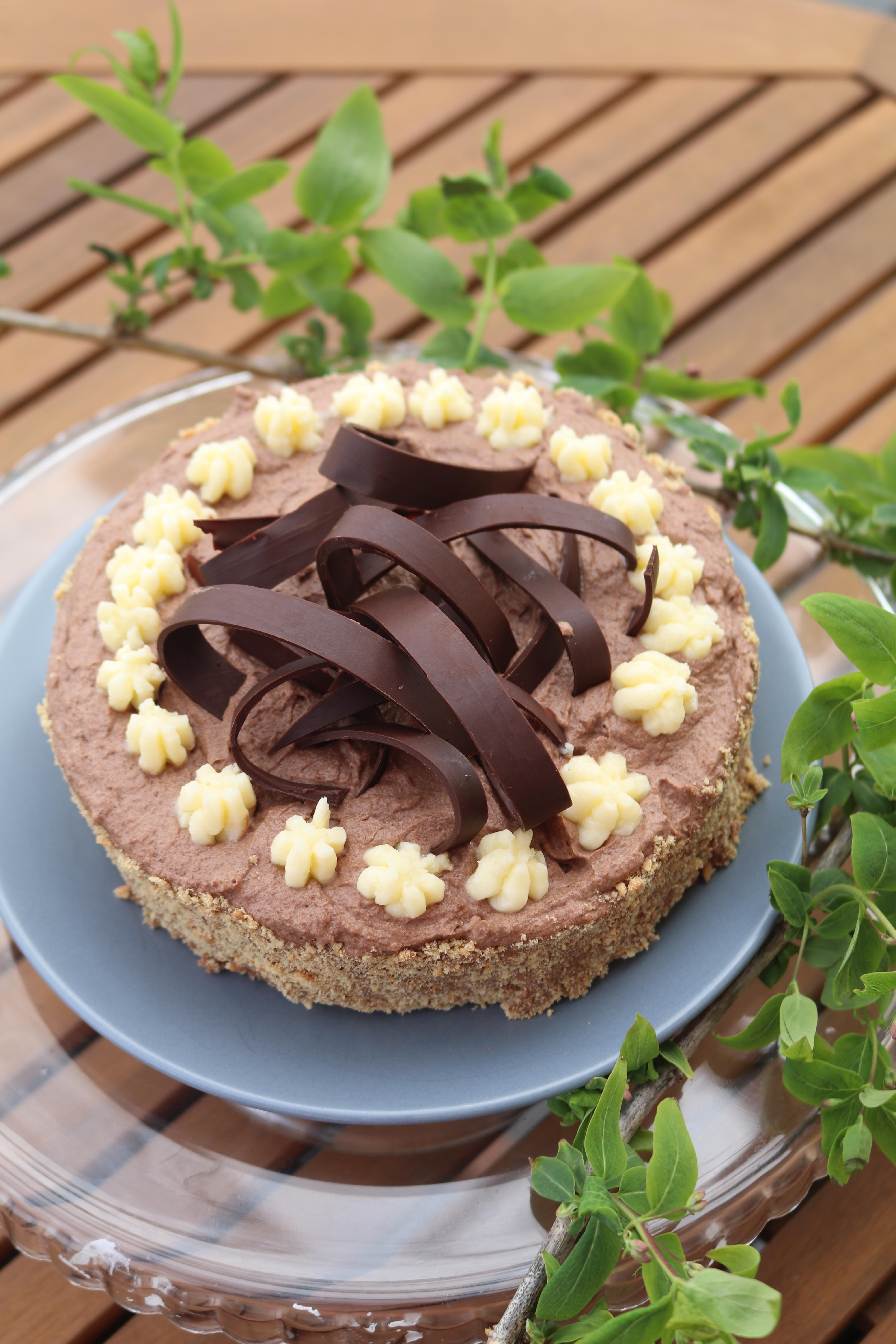 Kiaušinio baltymus įpilkite į stiklainį, uždenkite maistine plėvele ir padarykite joje keletą skylučių, palikite baltymus kambario temperatūroje 1–3 dienoms. Kitą dieną, dar geriau po 3 dienų, sumaišykite miltus, riešutus ir 185 g cukraus. Įkaitinkite orkaitę iki 150 °C. Išklokite kepimo popieriumi dvi apvalias kepimo formas – 23 cm ir 20 cm skersmens. Baltymus suplakite iki purumo, tada po truputį berkite cukraus pudrą ir plakite, kol masė taps standi ir blizgi. Pabaigoje įpilkite ir įplakite vanilės ekstraktą. (Galima baltymus plakti virtuvės kombainu: baltymus įpilkite į kombaino indą ir pradėkite plakti minimaliu greičiu, plakite apie 3 min. arba kol baltymai suputos, tada padidinkite greitį ir suplakite iki purumo. Taip suplaktų baltymų struktūra bus standesnė.) Į baltymų masę įberkite riešutų mišinį ir labai atsargiai su mentele išmaišykite. Tešlą padalykite į dvi dalis, vieną sumaišykite su kakava. Tešlą pilkite į dvi kepimo formas ir pašaukite į orkaitę. Kepkite 2 val. Išimkite kepimo formas iš orkaitės ir palikite pastovėti 12–24 val., kad tešla sutvirtėtų. Pieną ir kiaušinį suplakite, kad jie susijungtų (ne daugiau). Įpilkite pieno mišinį į puodą ir įberkite cukrų (225 g). Virkite ant vidutinės ugnies nuolat maišydami iki užvirimo. Sirupas turi šiek tiek sutirštėti (būtinai). Atvėsinkite iki kambario temperatūros. Sviestą suplakite iki purumo. Toliau plakdami po truputį pilkite sirupą ir plakite iki purios, kreminės konsistencijos. Pabaigoje įplakite vanilės ekstraktą ir konjaką. Užvirkite grietinėlę ir užpilkite ant 150 g šokolado. Palikite pastovėti 2 min., tada išmaišykite iki vientisos masės. Atvėsinkite iki kambario temperatūros ir įdėkite į šaldytuvą, nes ganašas – šokolado ir grietinėlės tirpalas – prieš jį suplakant turi būti labai šaltas. (Paruošti geriausia iš vakaro, kad naktį pastovėtų šaldytuve.) Išimkite ganašą iš šaldytuvo ir suplakite iki purios konsistencijos. Šokoladiniams papuošimams išlydykite 50 g šokolado ir mentele tolygiai paskirstykite ant acetato juostos arba ant kepimo popieriaus lapo. Palaukite 2 min. ir perbraukite per šokolado juostą dantyta mentele. Liks ilgos šokoladinės juostos. Palaukite, kol šokoladas ims stingti, tada susukite juostą ir palikite sustingti iki galo (galima įdėti į šaldytuvą). Kai šokoladas sustings, nuimkite juostą. Sutepkite tortą. Padėkite mažesnį tešlos blyną ant didesnio ir apipjaustykite didesnį taip, kad būtų vienodi. Apipjaustytas dalis susmulkinkite – įdėkite į maišelį ir sugrūskite kočėlu (trupinius naudosime šonų papuošimui). Torto padėkliuką patepkite trupučiu kremo ir padėkite ant jo vieną tešlos blyną. Ant jo uždėkite 3/4 kremo ir tolygiai paskirstykite mentele. Ant viršaus padėkite kitą tešlos blyną (viršumi į apačią, taip viršus bus lygus ir mažiau sunaudosite šokoladinio kremo išlyginti viršų) ir lengvai prispauskite. Torto šonus ir viršų patepkite šokoladiniu kremu ir išlyginkite mentele. Šonus aplipdykite / apibarstykite trupiniais. Papuoškite šokoladinėmis juostomis. Įdėkite tortą nakčiai į šaldytuvą (arba bent jau 2 val.).