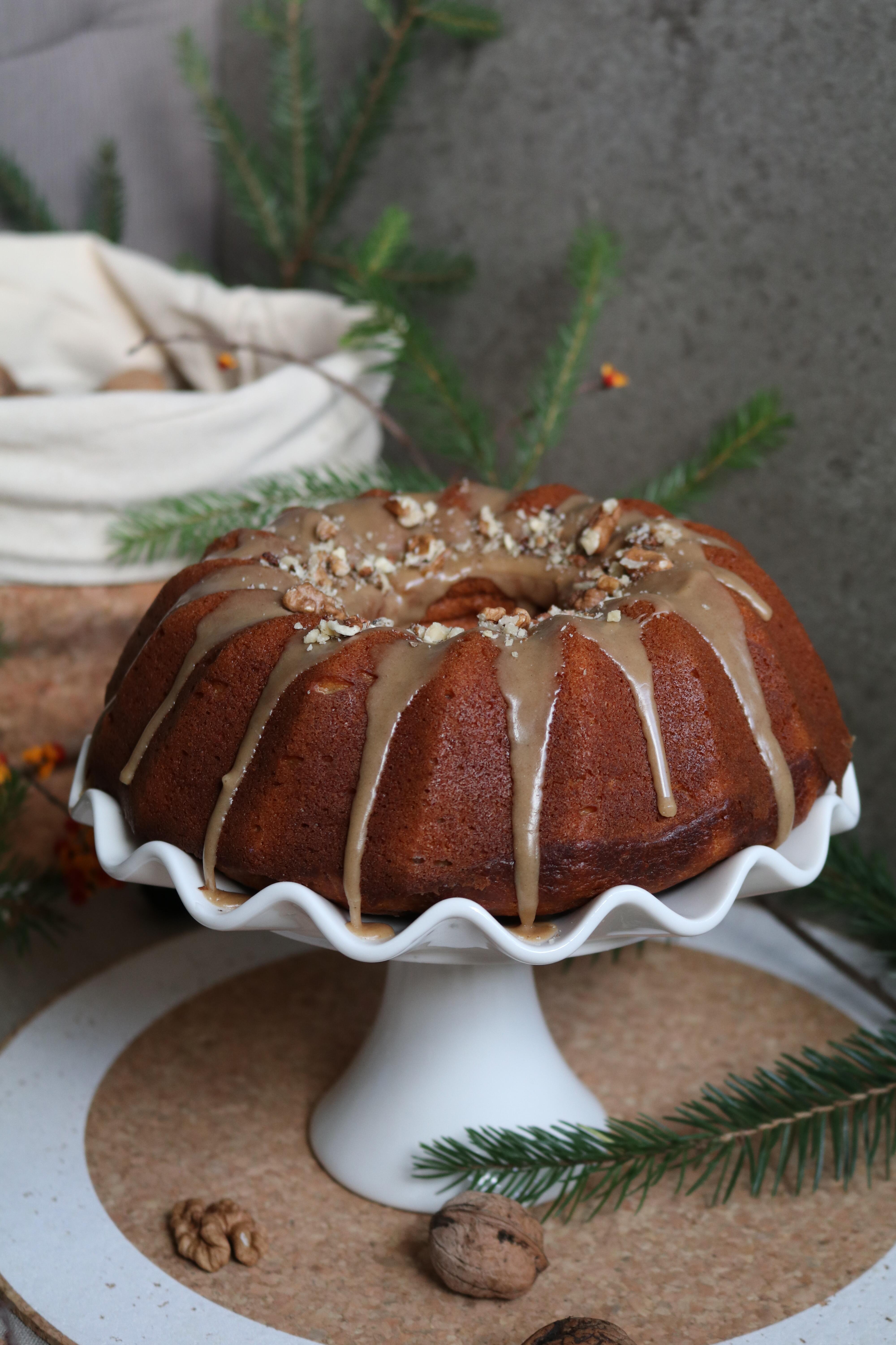 Įkaitinkite orkaitę iki 180 °C. Kepimo formą išpurkškite aliejumi arba ištepkite sviesto gabalėliu. Dubenyje sumaišykite miltus, kepimo miltelius, cinamoną, imbierą ir druską. Kitame dubenyje plakikliu išplakite sviestą ir cukrų iki šviesios ir purios masės. Įmuškite po vieną kiaušinius, supilkite vanilę. Į sviesto ir kiaušinių plakinį supilkite pusę sausų ingredientų mišinio. Supylę pirmą dalį gerai išplakite. Tada supilkite jogurtą, pieną ir vėl gerai išmaišykite. Galiausiai supilkite likusius sausus ingredientus. Tešlą supilkite į kepimo formą ir kepkite 180 °C orkaitėje apie 50 min. arba kol į pyrago vidurį įsmeigus medinį iešmelį jis liks švarus. Iškepusį keksą išimkite iš orkaitės ir palikite apie 10 min. atvėsti formoje. Tada apverskite ir išimkite, leiskite pyragui atvėsti ant grotelių. Glaistui nedideliame dubenyje išplakite cukraus pudrą, klevų sirupą, cinamoną ir pieną iki vientisos kreminės masės. Jei glajus per skystas, įberkite dar šiek tiek cukraus pudros. Jei per tirštas, įpilkite dar šiek tiek pieno. Lėtai užtepkite glajų ant atvėsusio kekso ir pabarstykite smulkintais graikiniais riešutais.