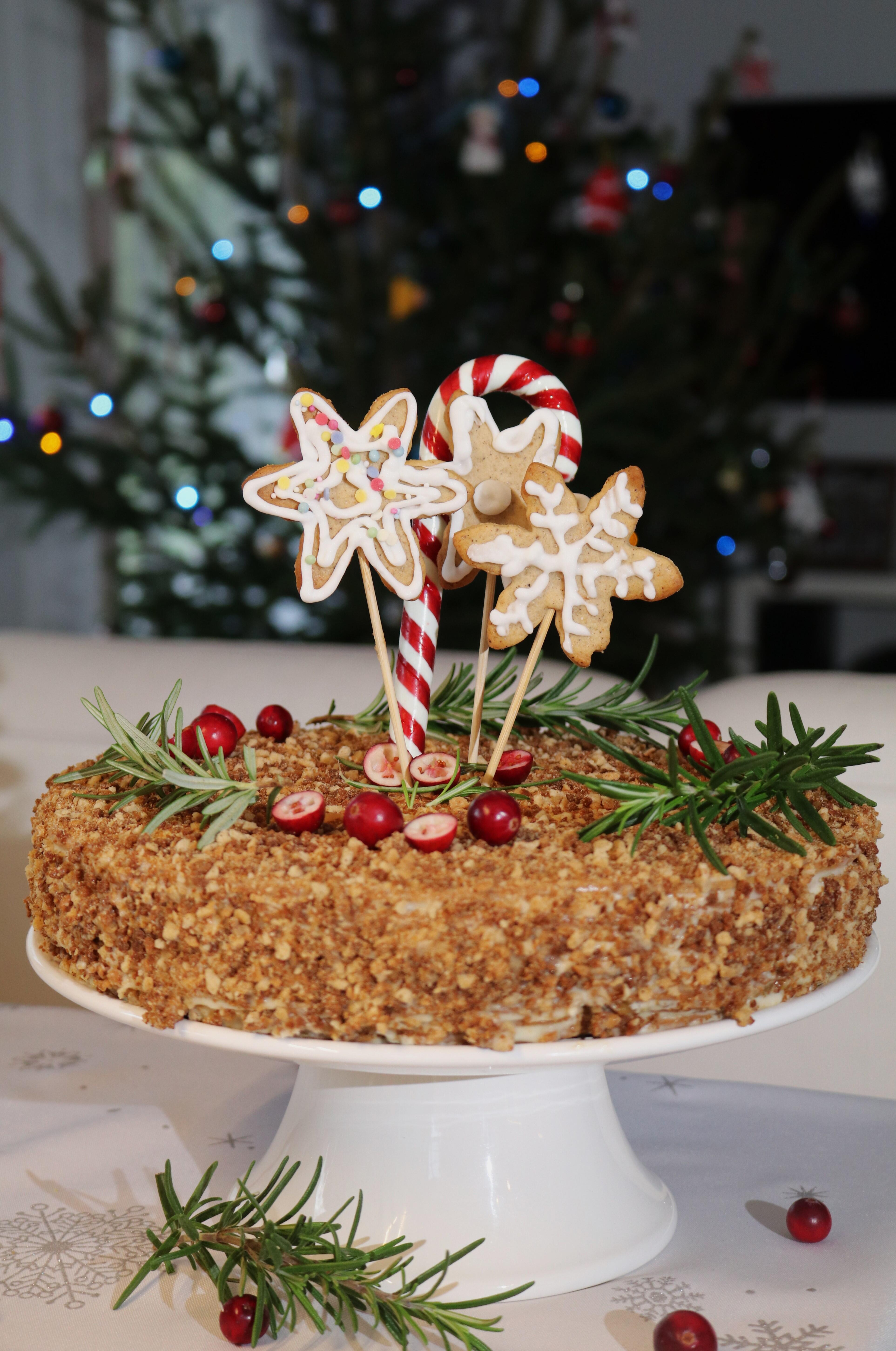 Kepkite torto lakštus. Pasiruoškite garų vonelę – ant puodo su vandeniu uždėkite dubenį taip, kad neliestų vandens. Į dubenį sudėkite sviestą, medų, cukrų ir kaitinkite, kol viskas ištirps. Leiskite kiek pravėsti. Kiaušinius išmaišykite su grietine. Miltus sumaišykite su kepimo milteliais ir cinamonu. Į truputį atvėsusį medaus mišinį supilkite kiaušinių masę ir išmaišykite. Įsijokite miltus. Masė išeis gan skysta. Padalykite ją į dvi dalis. Pabuvusi šaldytuve 4–6 val. (geriausia per naktį), tešla taps tinkama kočioti. Paviršių pabarstykite miltais. Iškočiokite pasiruoštos formos dydžio kuo plonesnius blynus. Man 26 cm formai išeina 10 blynų. Apipjautus kraštus taip pat iškepkite, juos panaudosite trupiniams torto papuošimui. Blynus po vieną kepkite kepimo skardoje, išklotoje kepimo popieriumi, iki 180 °C įkaitintoje orkaitėje 8–10 min. Užplikykite arbatą. Į didelį dubenį sudėkite visus kremui skirtus ingredientus. Plakite elektriniu plaktuvu, kol gausite tirštą, standžios tekstūros kremą. Pasiruoškite atsegamą torto formą. Kiekvieną lakštą aptepkite arbata, apelsinų džemu, ant viršaus tolygiai paskleiskite dalį kremo. Dėkite antrąjį biskvito lakštą, lengvai paspauskite delnais. Vėl aptepkite arbata, apelsinų džemu ir užpilkite kremu. Taip susluoksniuokite visus lakštus. Tortą dėkite į šaldytuvą ir palikite bent per naktį. Kuo ilgiau stovės šaldytuve, tuo tortas bus skanesnis. Nuimkite formos žiedą. Tortą apibarstykite trupiniais, papuoškite sausainiais.