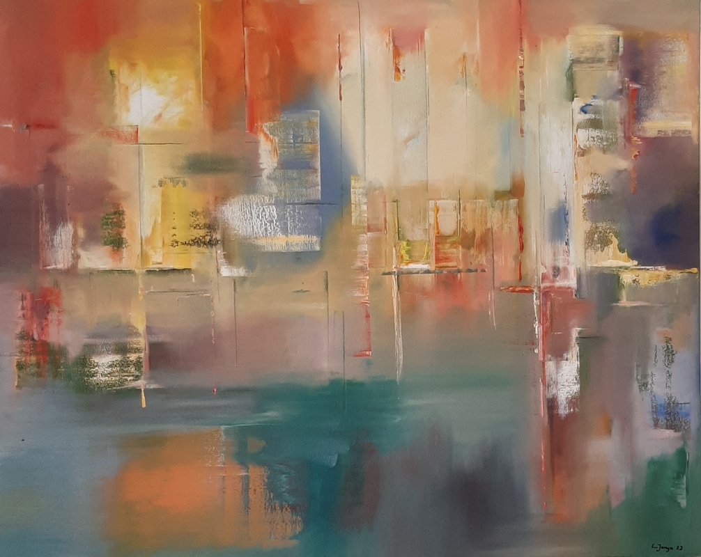 Atrodytų, aliejiniai dažai vienu tarsi lengvu mostu nubraukti, tačiau tai tik pirmo žvilgsnio efektas, dailininkės meistrystė ir siektas rezultatas tokio vaizdo, kurį matome greitai važiuodami pro automobilio, traukinio langą, kai besikeičiantys vaizdai, susiliedami į įvairiausias spalvines gamas, tampa išgyvenamomis būsenomis, nuotaikomis.