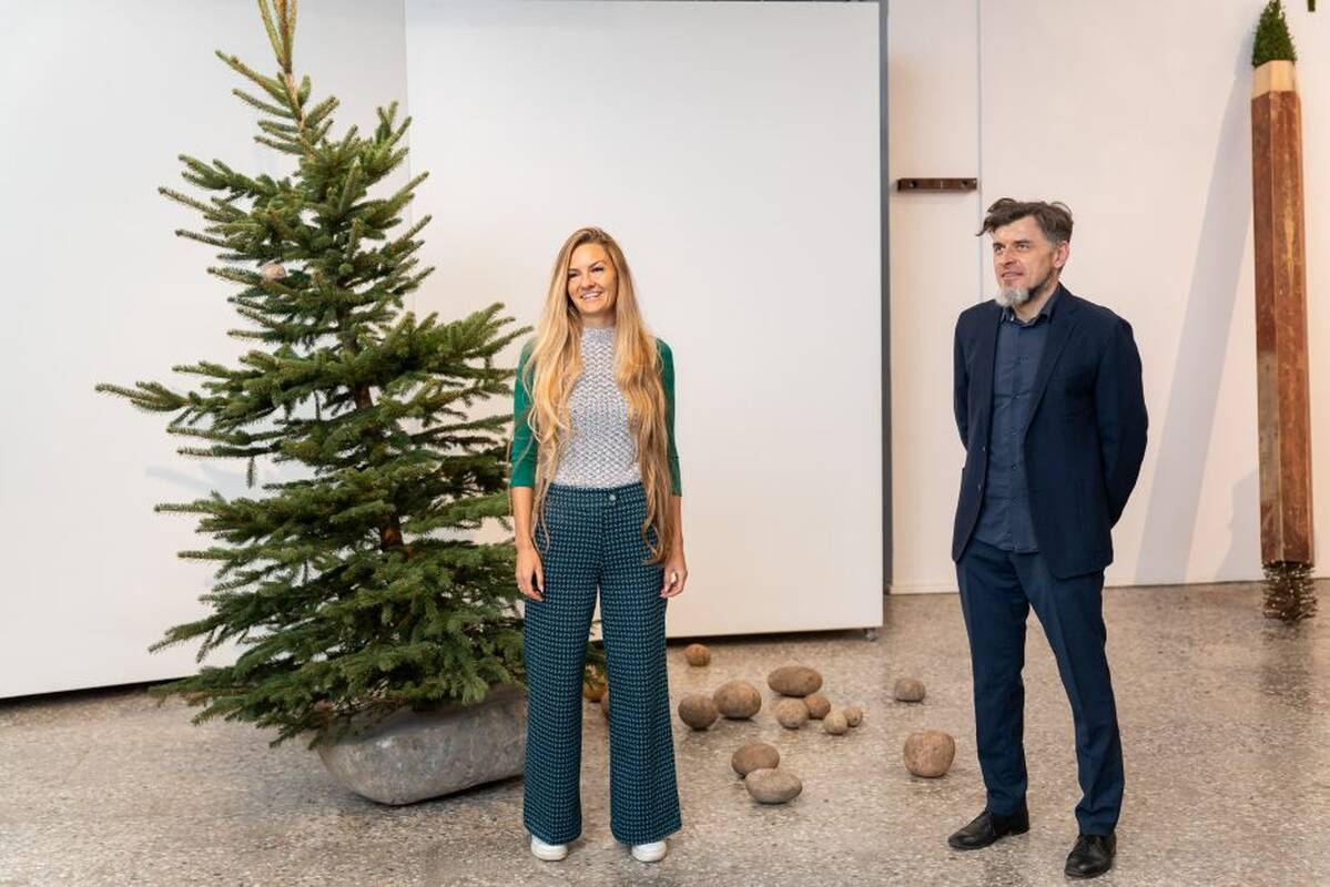 Lietuvos dailininkų sąjungos (LDS) Kauno skyriaus galerijoje atvėrusios skulptūrinių objektų parodos centre – į pusiau perpjautą didžiulį riedulį įsodinta eglutė. Pasvirusi – prie žemės ją traukia vienintelis ant jos kabantis žaisliukas – nedidelis akmuo.