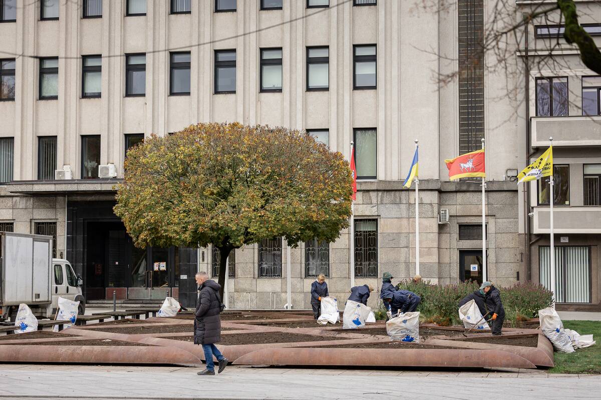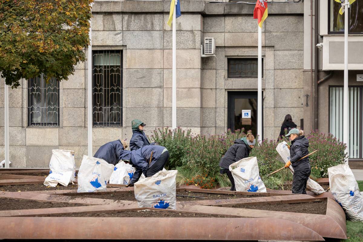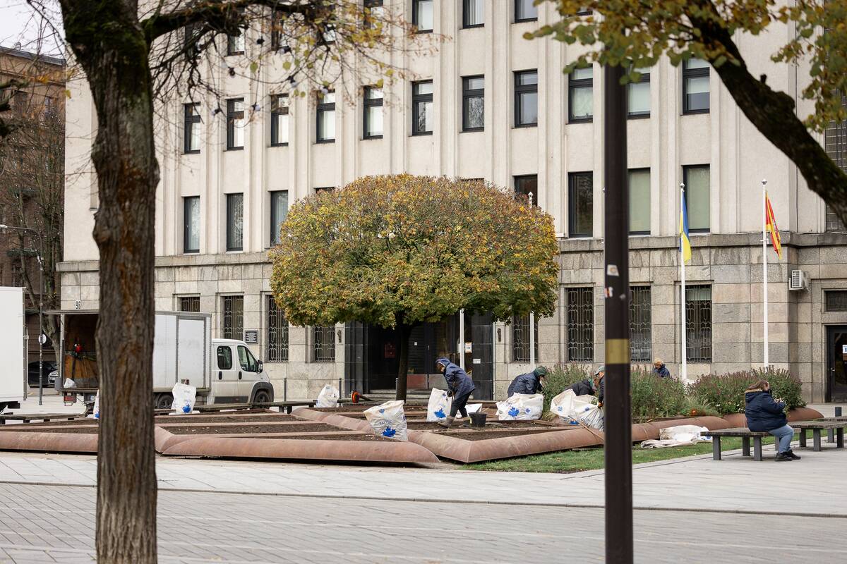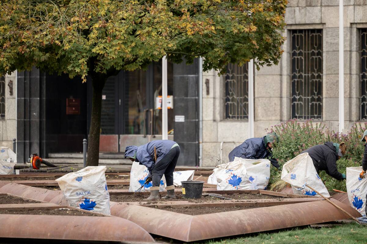 Miesto gėlynai jau ruošiami žiemai, darbininkai nuėmė dar ką tik žaliavusius ir žiedais džiuginusius želdinius. Dabar gėlių klombos kurį laiką liks tuščios.