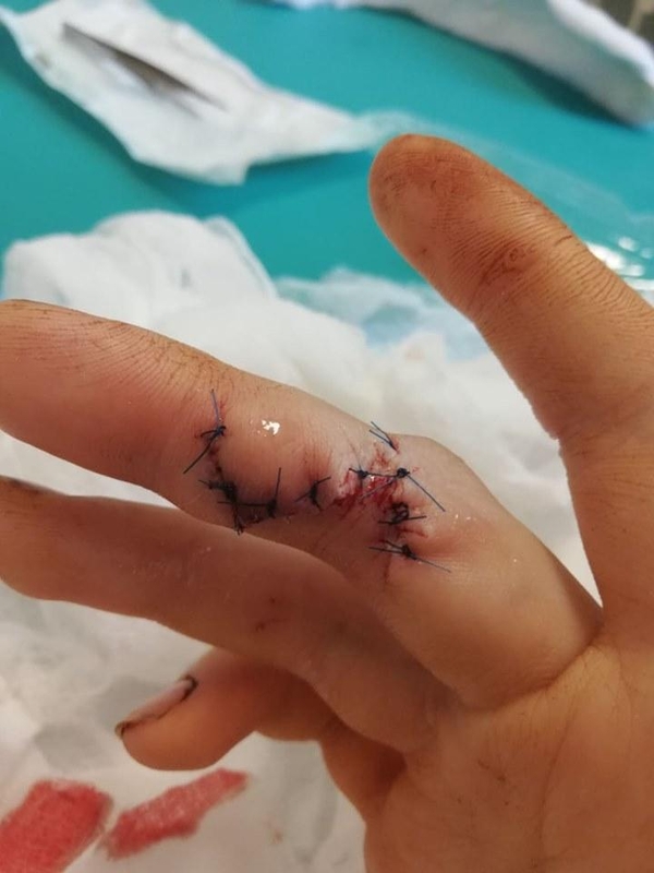 „Pamačiau, kad du mano dešinės rankos pirštai – smilius ir didysis – labai sužaloti, ypač kraujavo didysis pirštas. Padėjau padėklą ir nuėjau atsisėsti, o kolegos atnešę ledo iškvietė greitosios medicinos pagalbos brigadą. Atvykę medikai sutvarstė mano du kraujuojančius pirštus, tačiau pakeliui į Kauno klinikas jiems teko stabtelėti, nes kraujavimas nesiliovė. Todėl gydytojai uždėjo ledo. Kai atvažiavome į Traumų ir skubios pagalbos centrą, pirmąją pagalbą medikai man suteikė greitai. Tiesa, šie kiek ilgiau užtruko surasdami veną keteteriui įvesti, nes nuspręsta statyti lašinę. Visa tai atlikę, gydytojai ant pirštų man uždėjo vienkartinės guminės pirštinės galiuką“, – įvykių eigą dėstė Sandra.