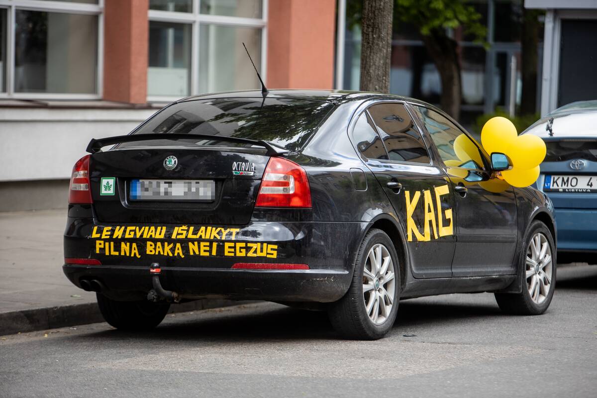 „Mokykla kaip Liudui kunigystė – nesužavėjo“, „Lengviau išlaikyti pilną baką nei egzus“, „Baygem mokiklą“, „Pašalpai gaut atestato nereike“ – tokie ir kiti užrašai puošė transporto priemones.