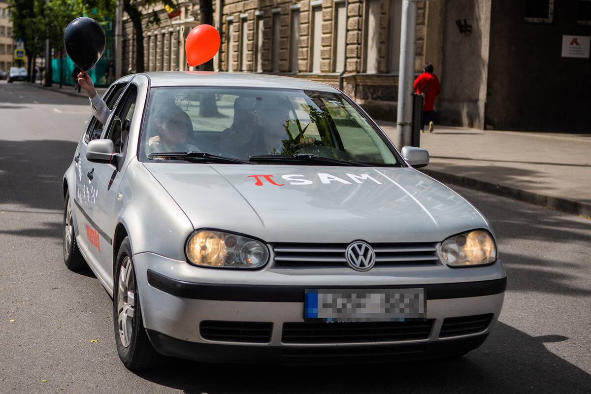 Jie į šventę, kaip ir pridera, rinkosi garsiai ir ryškiai. Šmaikštūs užrašai, puošmenos ant automobilių, garso signalai.