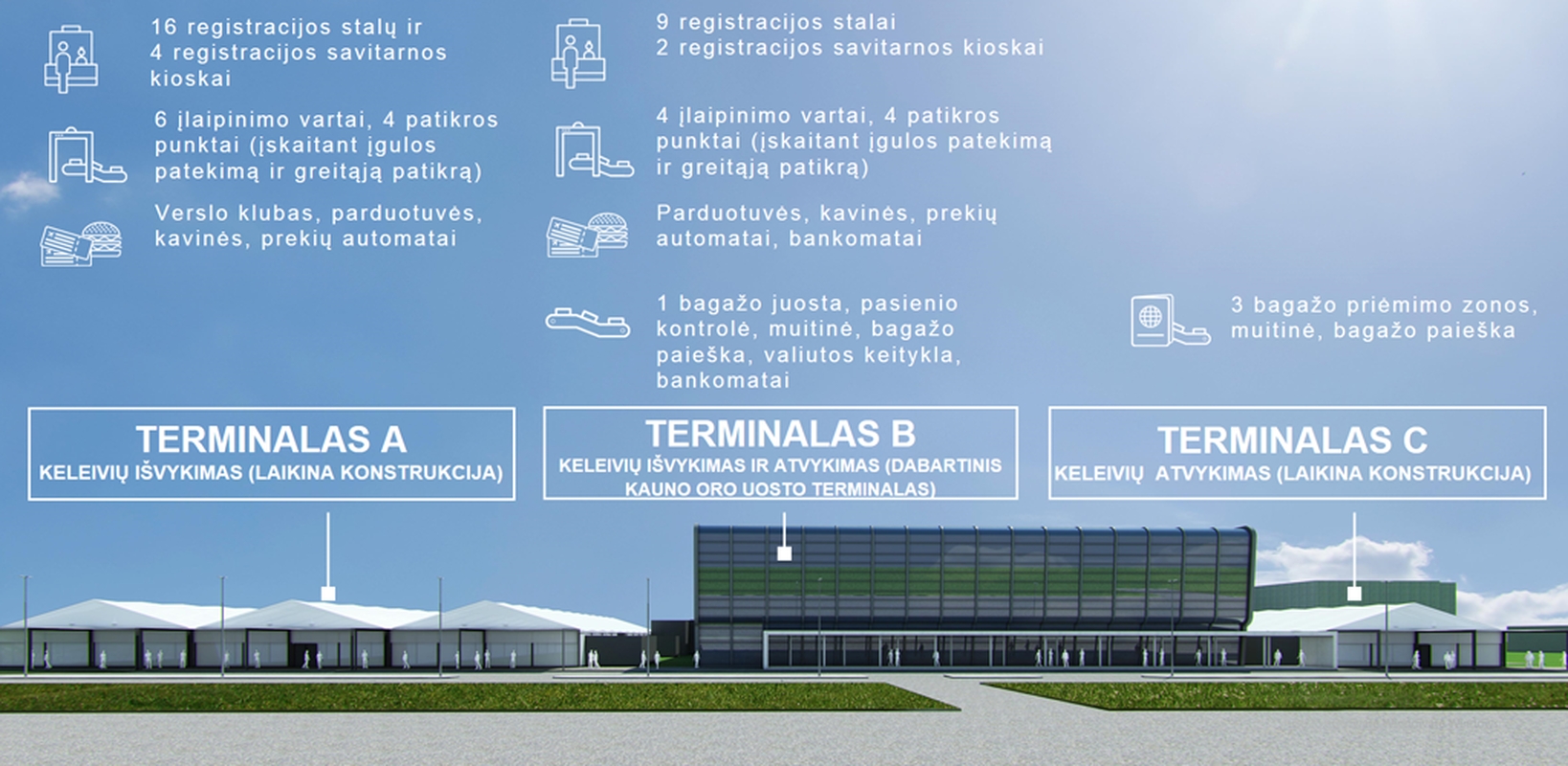 Laikiname A terminale bus įrengta 16 registracijos stalų ir 4 registracijos savitarnos kioskai, 6 įlaipinimo vartai, 4 patikros punktai. Taip pat – verslo klubas, parduotuvės, kavinės, prekių automatai. Nuolatinis Kauno oro uosto terminalas permainų laikotarpiu taps terminalu B. Jame veiks 9 registracijos stalai ir 2 registracijos savitarnos kioskai, 4 įlaipinimo vartai ir 4 patikros punktai, 1 bagažo atsiėmimo juosta. Laikiname keleivių atvykimo terminale C veiks 3 bagažo atsiėmimo zonos.
