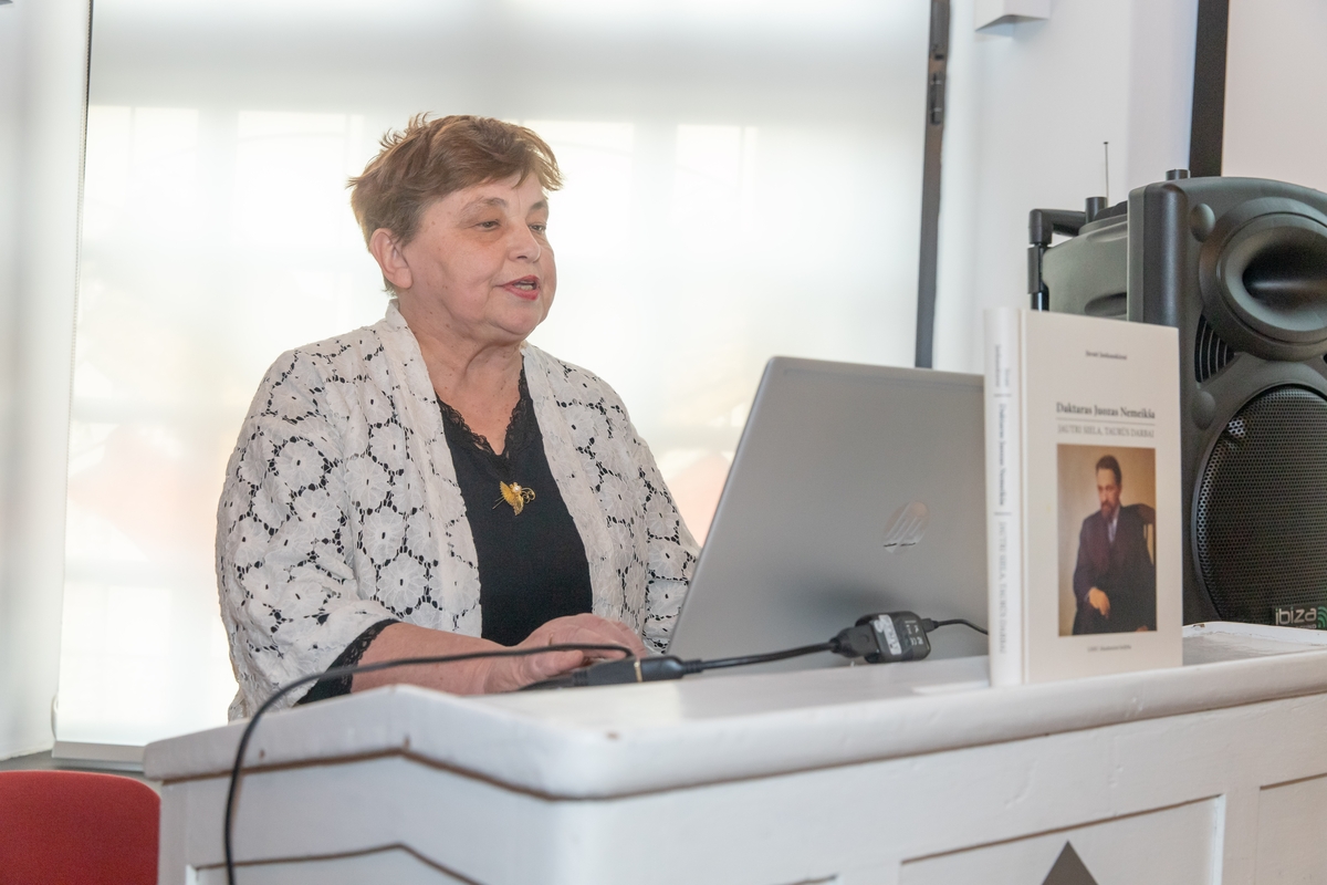 Pristatė: knygos autorė gydytoja J. Jankauskienė atskleidė visapusę J. Nemeikšos asmenybę. (Regimanto Zakšensko nuotr.)