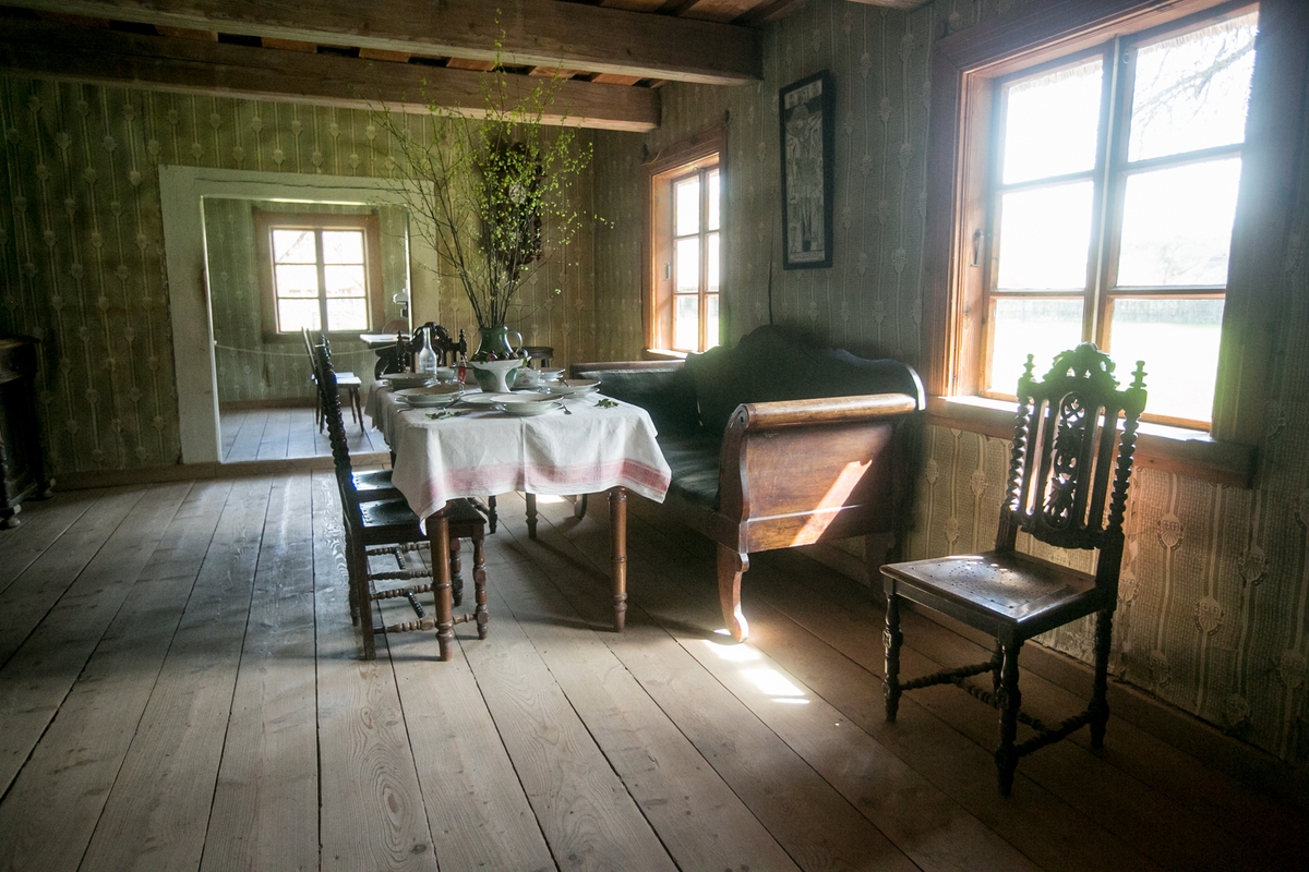 "Tai gegužinių pamaldų altorėlis, prie jo žmonės melsdavosi namuose. Čia, Darbėnuose, matome žemaitišką altorėlį, Suvalkijos sektoriuje jis kitoks", – pasakojo muziejaus darbuotoja, vedžiodama lankytojus po 1865 m. statytą gyvenamąjį namą, į Rumšiškes atkeliavusį iš Kretingos rajono. Gyvenamąjį namą buvus prabangų liudija ir tapetuotos sienos. Tiesa, muziejininkų teigimu, tapetais gyvenamieji kambariai greičiausiai pagražinti ne iškart po statybos, o šiek tiek vėliau.