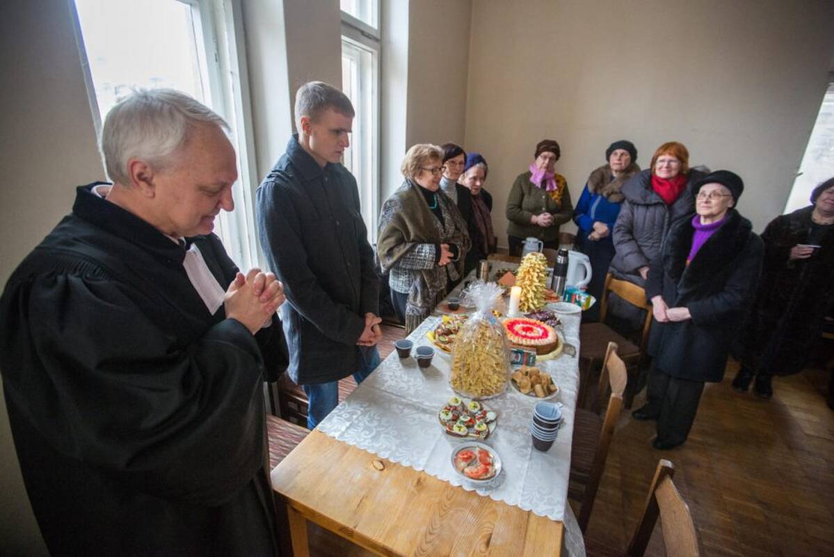 Po mišių bendruomenės nariai greitai išnešė kėdes, surado stalą, ant jo atsidūrė šakotis, sumuštiniai ir kitos vaišės. Moterys atnešė austą juostą ir pasveikino pastoriaus žmoną su gimtadieniu.