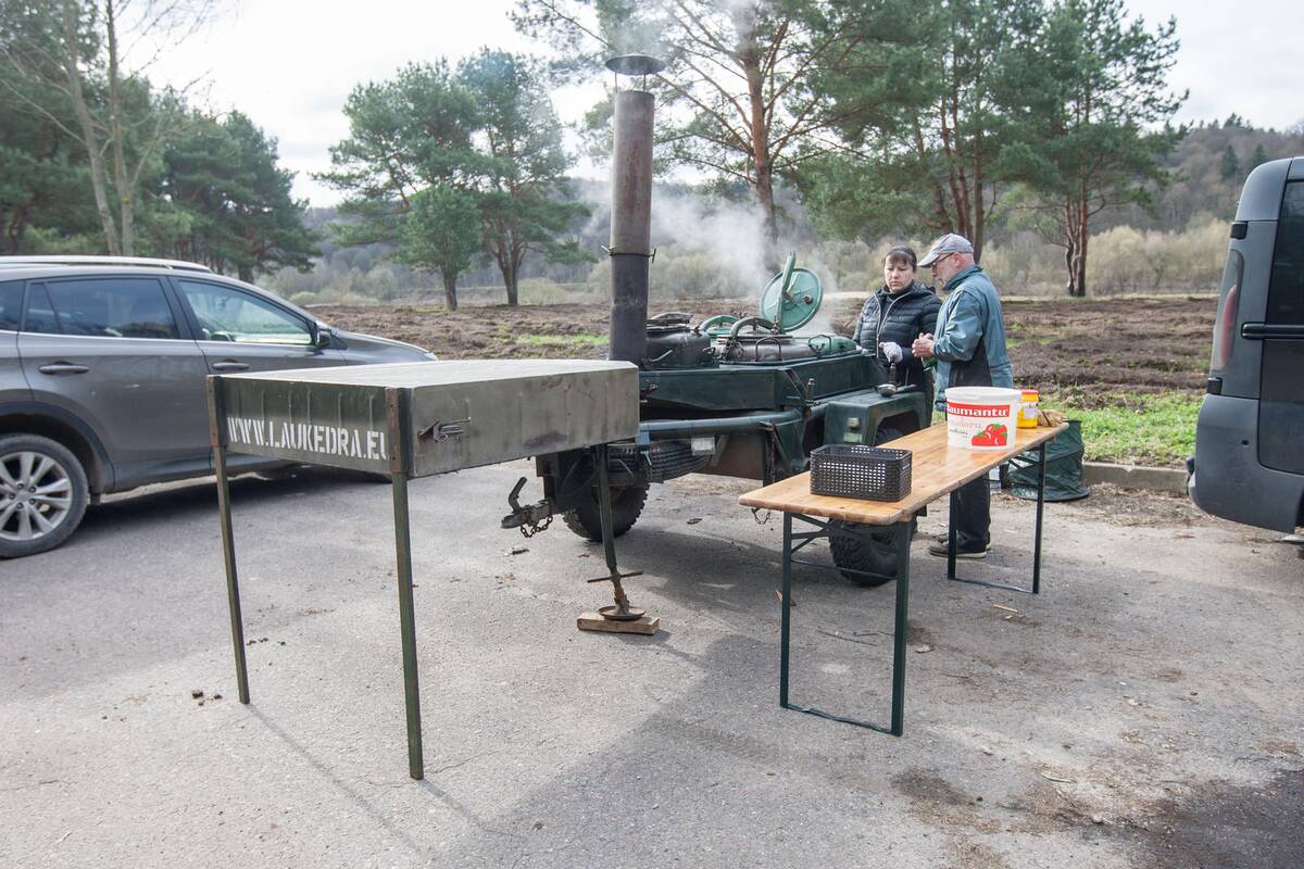 Vėliau, pietų metu, talkininkų laukė ne saldumynai, bet perlinių kruopų ošė su rūkyta šonine, kiaulienos kumpiu ir daržovėmis.