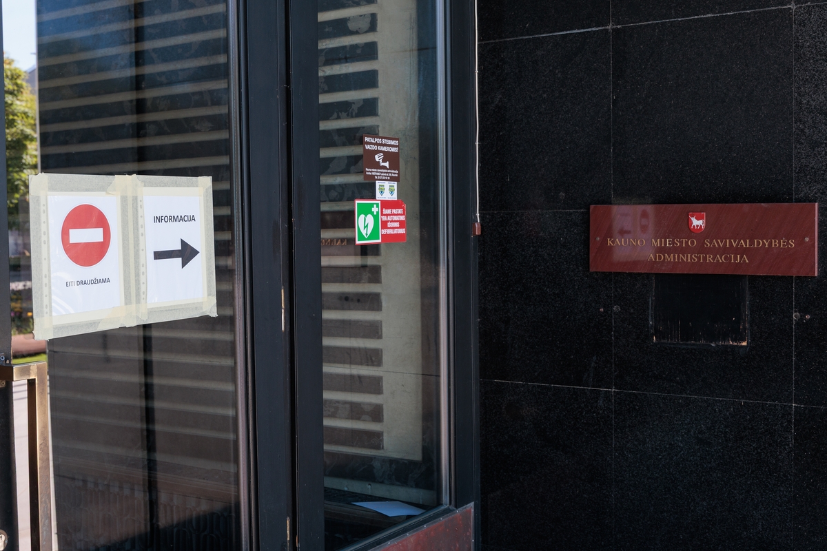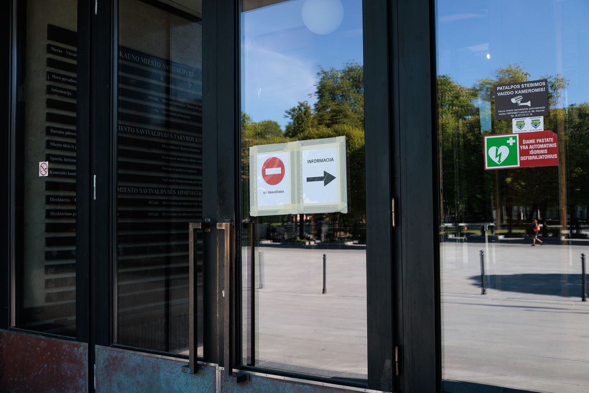 Šiuo metu Kauno miesto savivaldybės pagrindinis įėjimas užvertas, ant durų uždėtas įspėjamasis ženklas, kad į pastatą galima patekti pro šonines duris, kurios anksčiau būdavo atveriamos, jei atvykdavo žmonės, judantys vežimėliais.