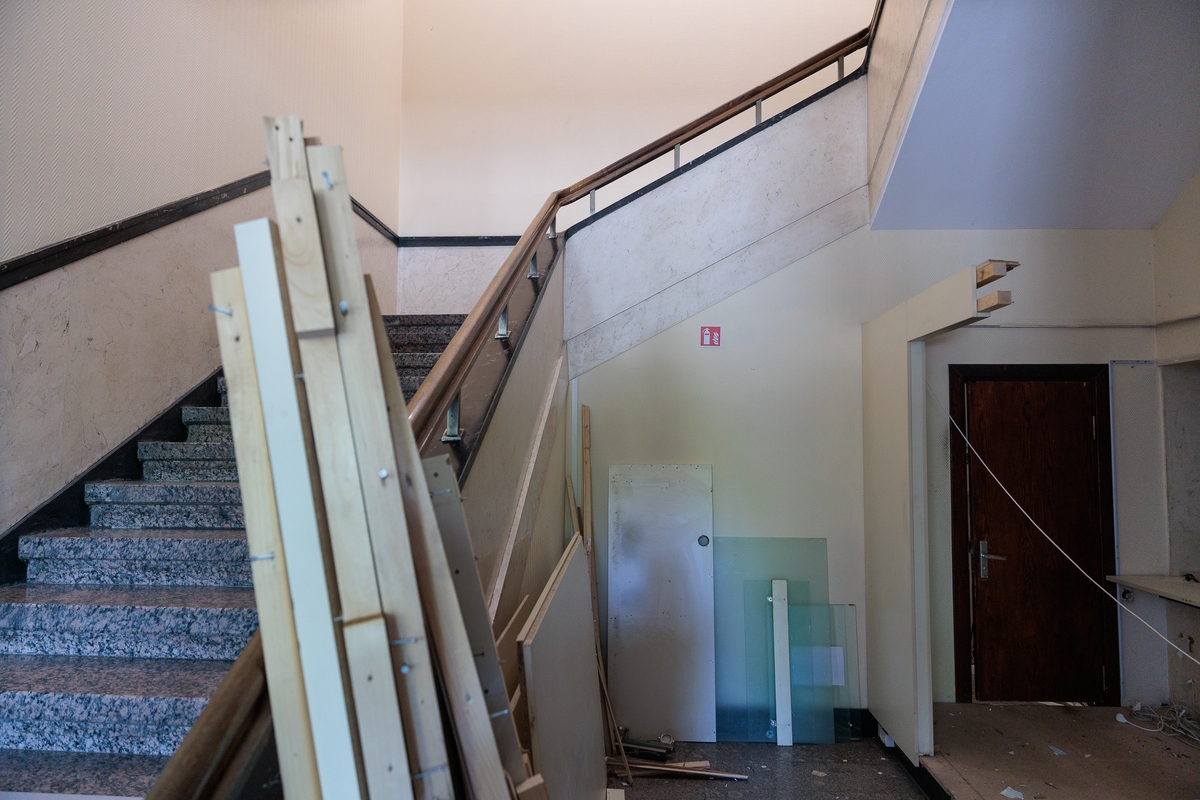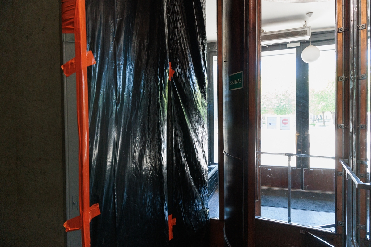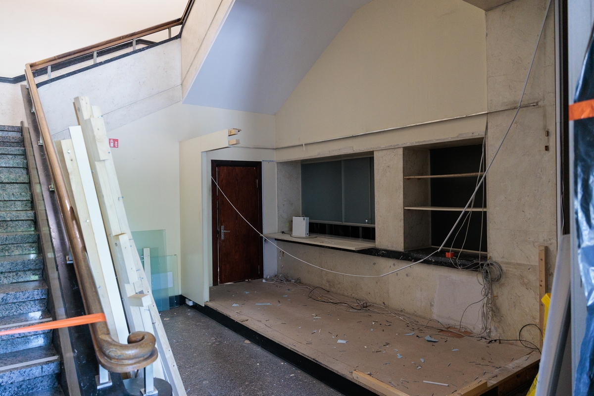 Prie Didžiosios salės pasitinka pastoliai, aptraukti juoda plėvele. Salės durys pažymėtos juostomis, skelbiančiomis, kad ir ši vieta sulauks pokyčių.