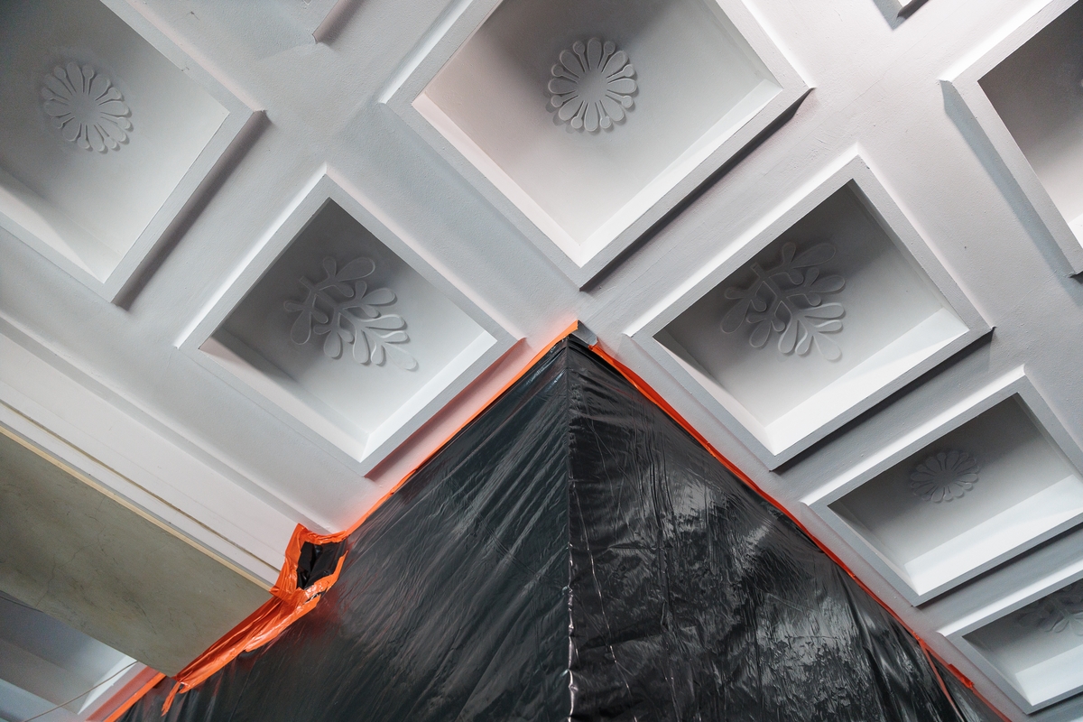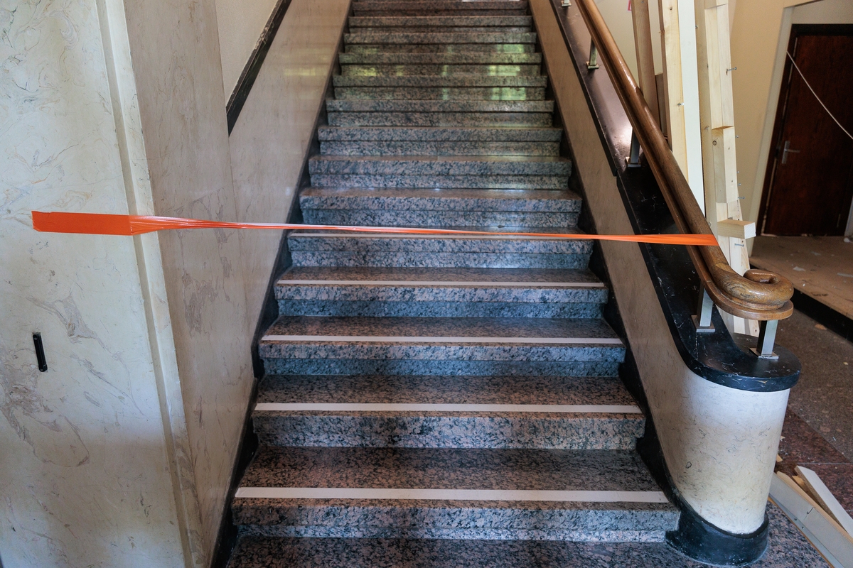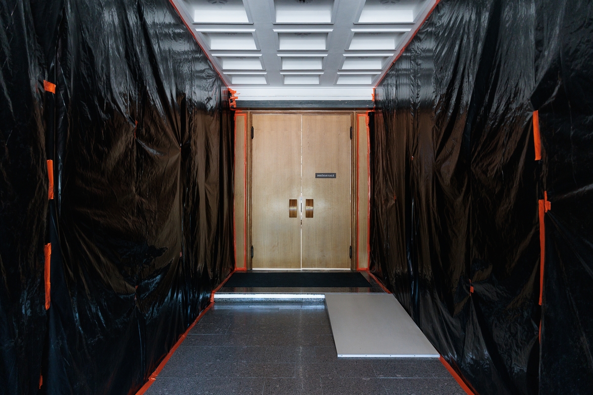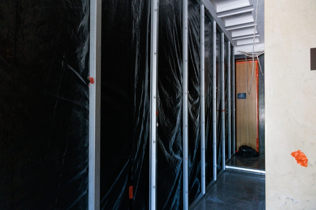 Prie Didžiosios salės pasitinka pastoliai, aptraukti juoda plėvele. Salės durys pažymėtos juostomis, skelbiančiomis, kad ir ši vieta sulauks pokyčių.