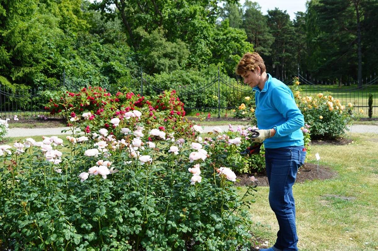 Rožyno priežiūrai Palangos botanikos parko lauko gėlininkystės specialistė Virginija Kniežienė kiekvieną dieną skiria po šešias valandas. „Visos rankos subraižytos, vis dėlto rožyno priežiūra – malonus darbas“, - šypsojosi V. Kniežienė.
