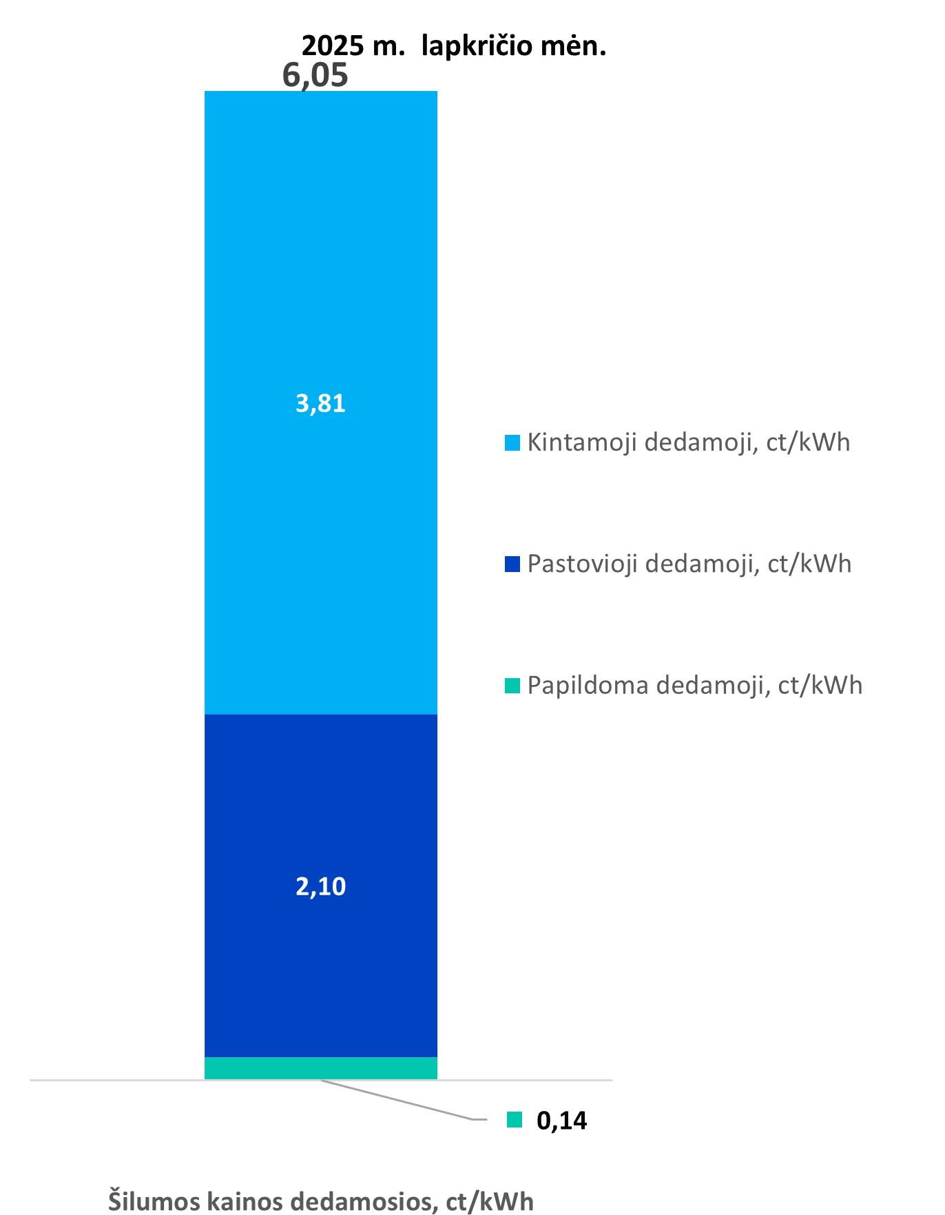 Paskutinį rudens mėnesį šiluma Klaipėdos ir Gargždų gyventojams kainuos 6,59 ct/kWh (su PVM). Tai maždaug 2 proc. daugiau nei spalį, kai šilumos kaina siekė 6,43 ct/kWh (su PVM), tačiau 1 proc. mažiau nei prieš metus – 2024-ųjų lapkritį šiluma kainavo 6,66 ct/kWh (su PVM).