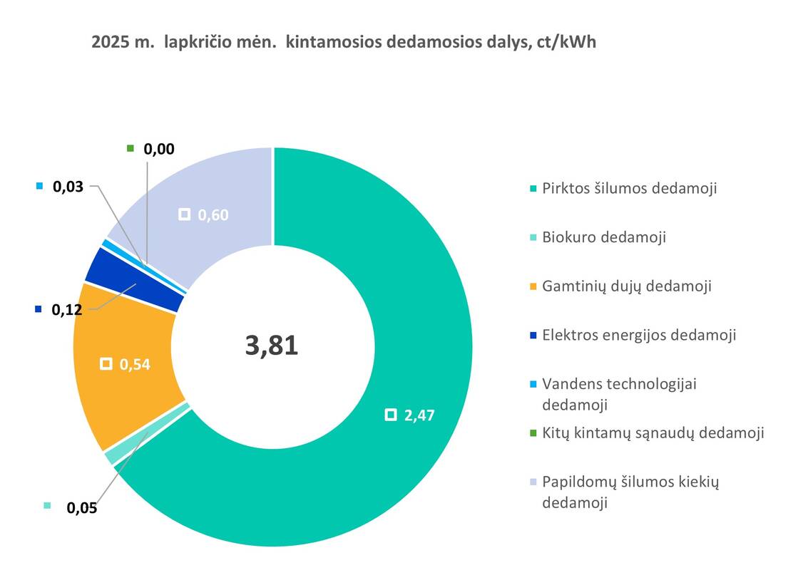 Centralizuotai tiekiamos šilumos kainą sudaro pastovioji kainos dedamoji, kintamoji kainos dedamoji, papildoma dedamoji ir pridėtinės vertės mokestis (PVM). Didžiausią kainos dalį sudaro kintamoji dalis, kuri apima biokuro, dujų, elektros energijos, vandens, kitų kintamų sąnaudų bei šilumos, superkamos iš nepriklausomų gamintojų, kaštus.