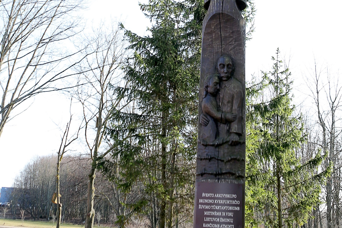 Devynių metrų aukščio kryžių su Brazinskų atvaizdu išdrožė vilnietis tautodailininkas Algirdas Judickas.