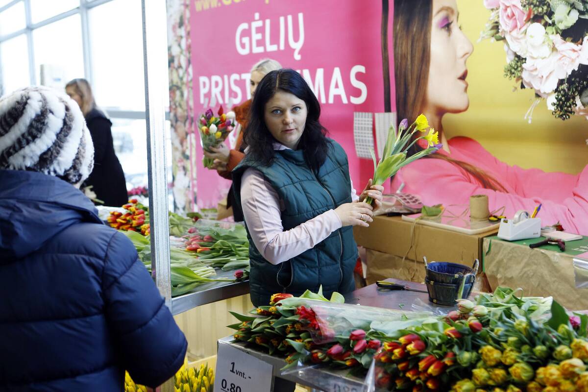 Tulpių kaina Naujajame turguje siekė 0,80 euro už vienetą, šių gėlių pakuotė vyrams atsiėjo nuo 20 eurų. Gėlės atvežtos iš Lenkijos, Olandijos.
