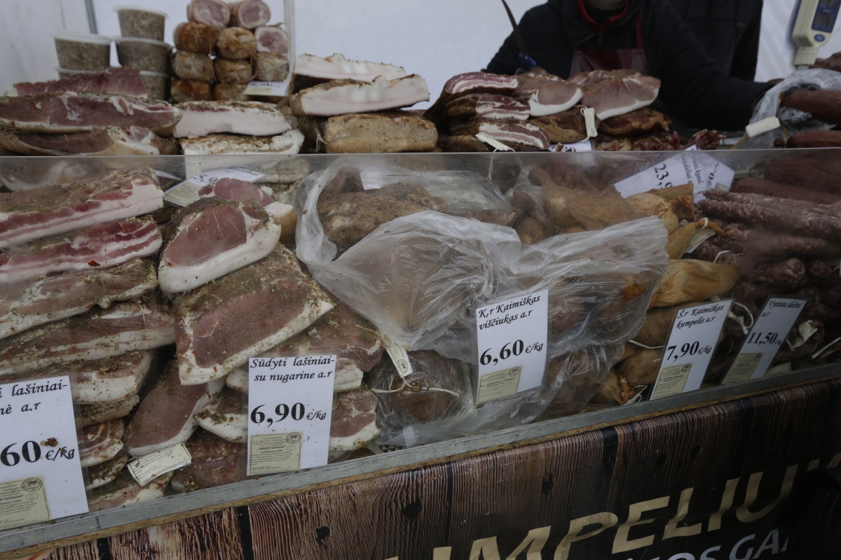 Sūdytos šoninės kaina – nuo 6,60 iki 8,90 Eur už kilogramą, vytintos dešros kaina siekė 11,5 Eur taip pat už kilogramą.