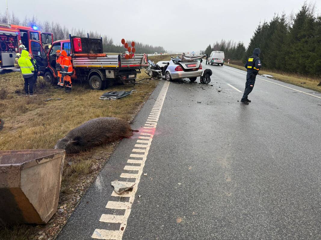 Priešgaisrinės apsaugos ir gelbėjimo departamentas BNS informavo, kad lengvasis automobilis susidūrė su šernu. Vairuotojas prispaustas automobilyje. Pasak ugniagesių gelbėtojų, jis sąmoningas.