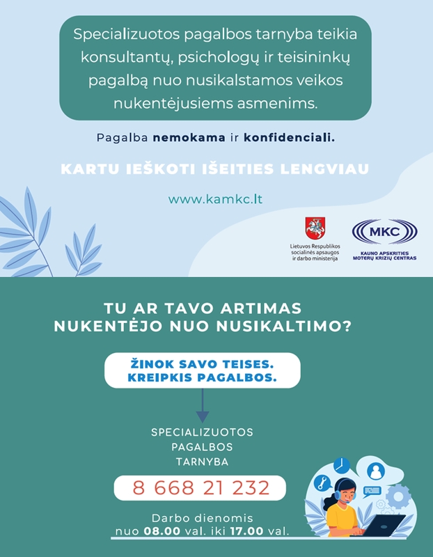 2021 m. priimtas įstatymas, numatantis pagalbą asmenis, nukentėjusiems nuo nusikalstamos veikos. Jame numatyta, kad nukentėjęs asmuo, nepriklausomai nuo to, ar kreipėsi į policiją, turi teisę gauti specialistų pagalbą. Lietuvoje tokias paslaugas teikia akredituotos pagalbos tarnybos. Per 2021 metus nukentėjusiems asmenims buvo suteikta daugiau kaip 5 tūkst. įvairių paslaugų.