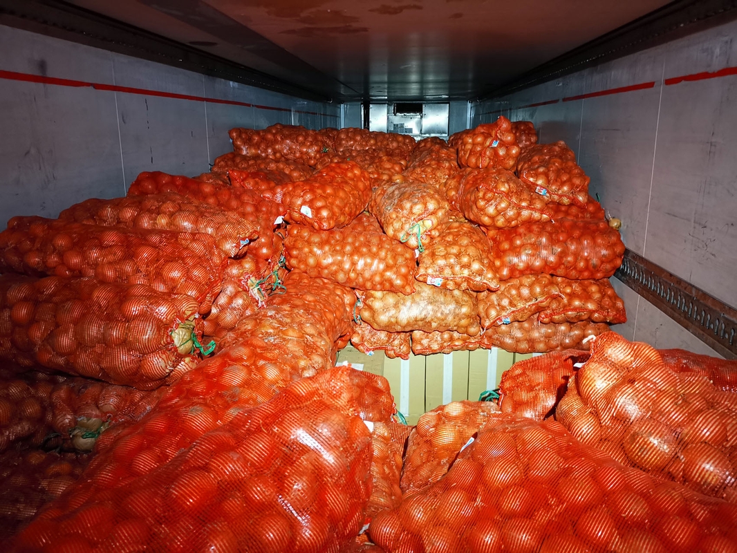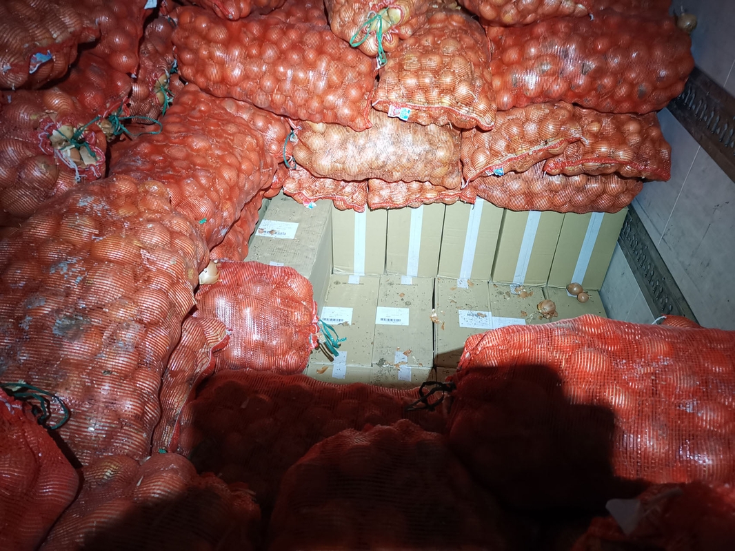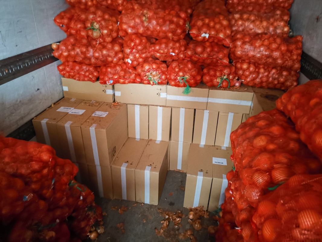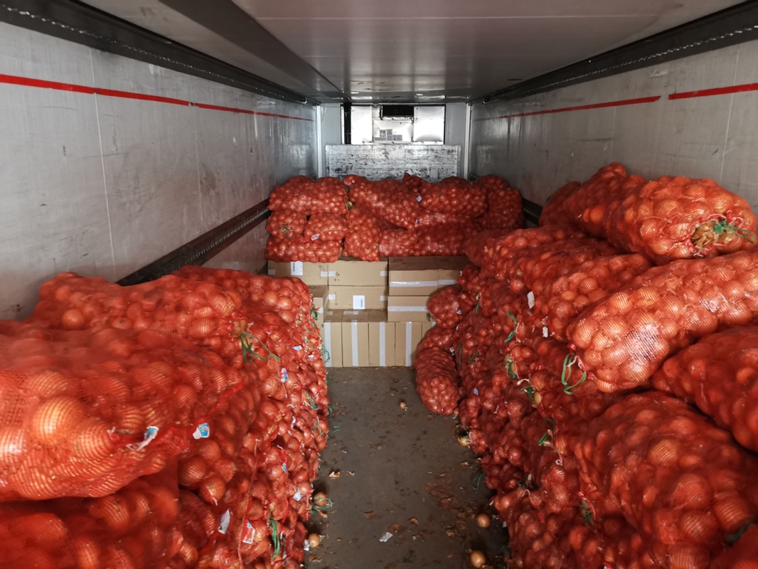 Patikrinus vilkiką rentgeno kontrolės sistema nustatyta, kad po maišais su svogūnais buvo slepiamos kontrabandinių cigarečių dėžės.