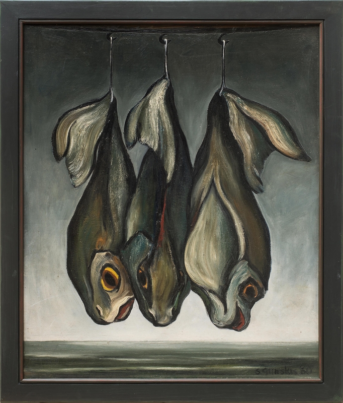 Tapybos darbo "Žuvys" (1980 m.) stilistika yra minimali, tačiau deformuojanti, išryškinanti, metaforiškai kalbanti apie laikinumo, efemeriškumo, paprastumo ir komplikuotumo sąveikas. Trys – gana dažnas skaičius menininko kūryboje: trys žuvys, trys varnos, tačiau sunku pasakyti, kiek autorius paiso skaičių simbolikos, kiek ji jam yra reikšminga, nes svarbiausiu jo tapybos darbų skiriamuoju bruožu išlieka įspūdis, nuotaika, ironija, groteskas, kultūrinės tradicijos deformacija.