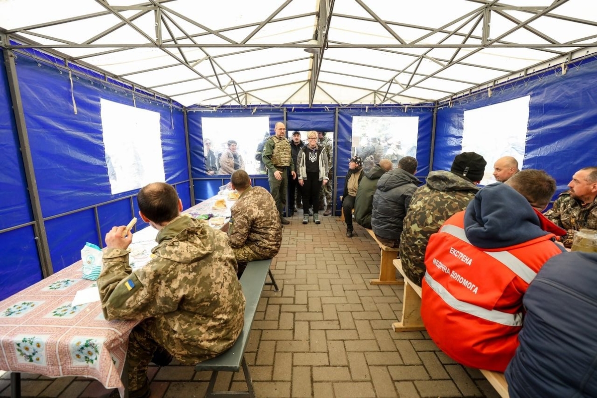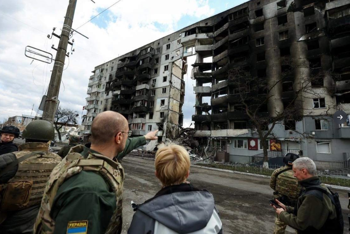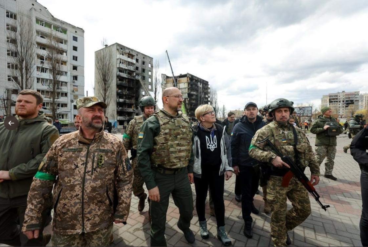 Nuotraukose matyti, kaip I. Šimonytė su ją lydinčiu Ukrainos premjeru Denysu Šmyhaliu karių apsuptyje apžiūri sugriautą daugiabutį Borodiankoje.