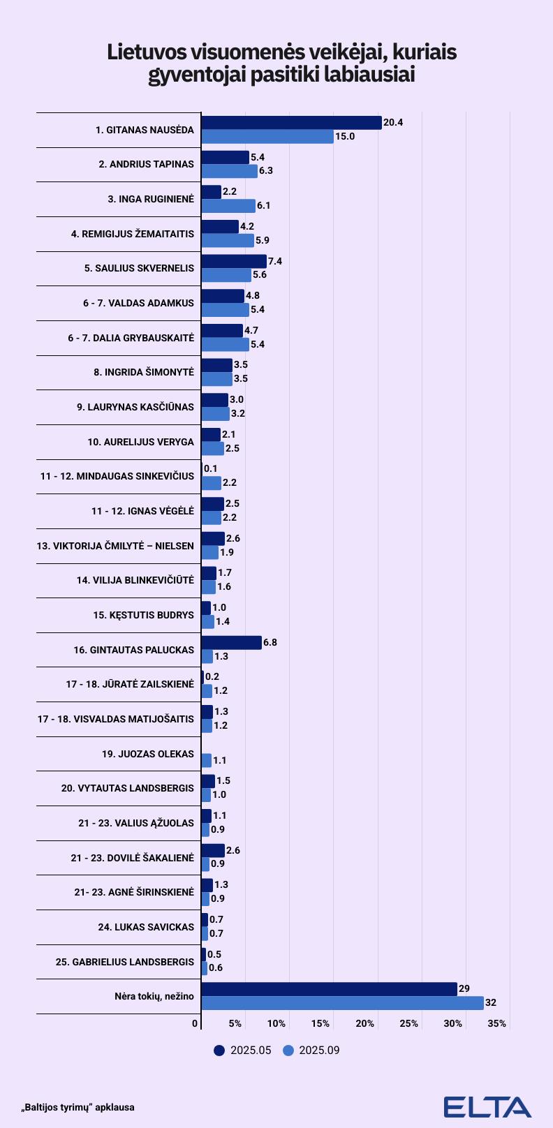 15 proc. tyrimo dalyvių nurodė, kad labiausiai pasitiki prezidentu G. Nausėda. Lyginant su šių metų gegužę atlikta apklausa, per paskutinius keturis mėnesius teigiančių, kad labiausiai pasitiki šalies vadovu, sumažėjo 5 procentiniais punktais (gegužę G. Nausėdą įvardijo 20,4 proc. respondentų).