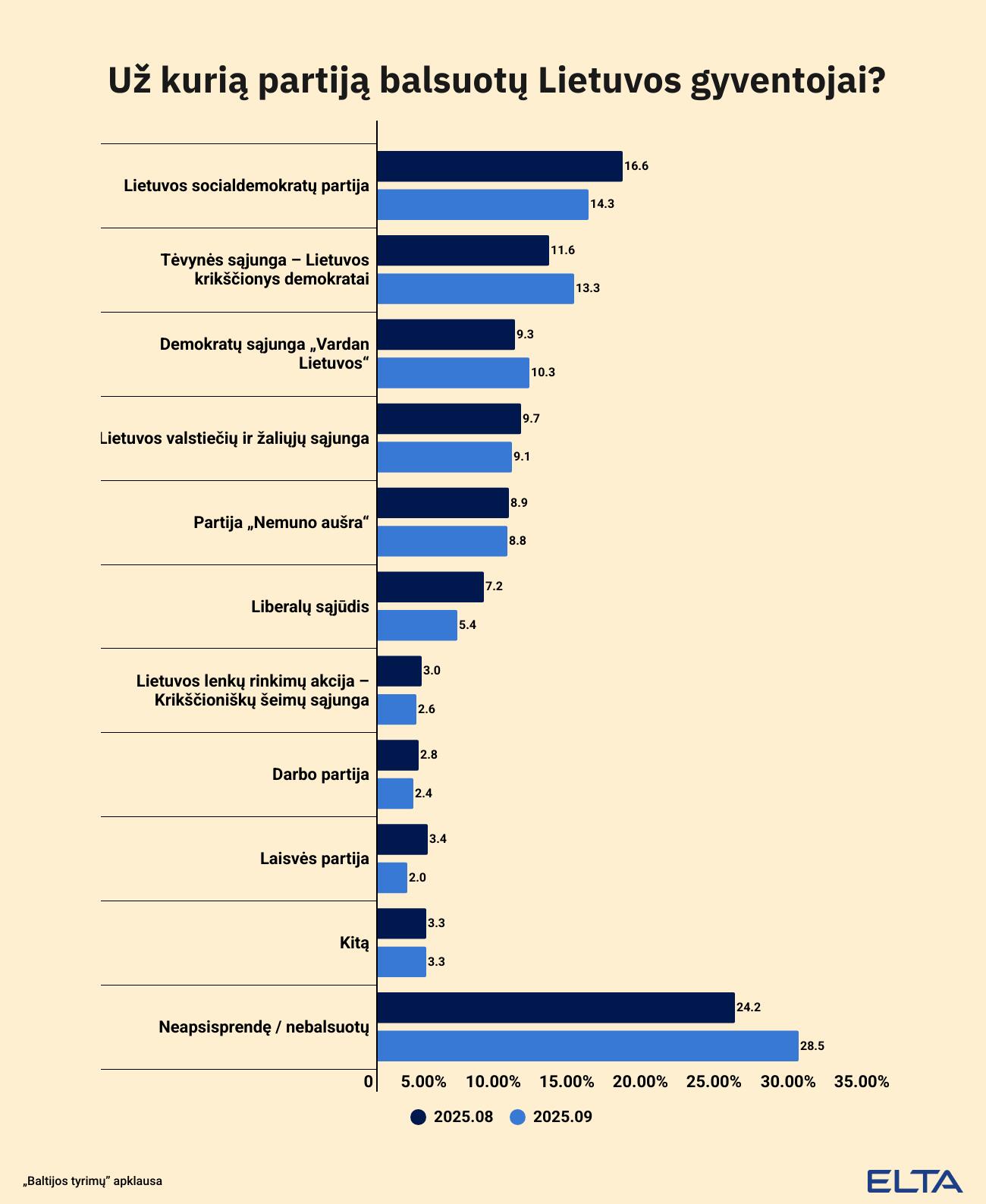 Jeigu artimiausią sekmadienį vyktų Seimo rinkimai, daugiausiai palaikymo sulauktų valdančioji Lietuvos socialdemokratų partija (LSDP) – už Mindaugo Sinkevičiaus vedamą politinę jėgą balsuoti ketintų 14,3 proc. respondentų. Rugpjūtį tokios pozicijos laikėsi 16,6 proc. tyrimo dalyvių.