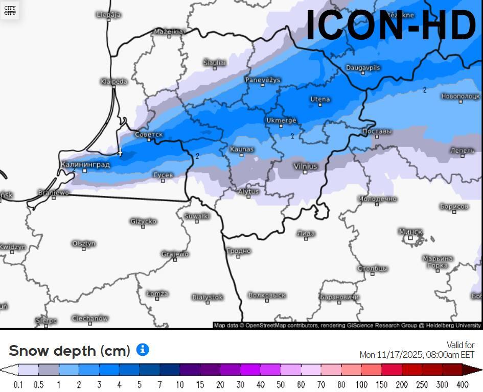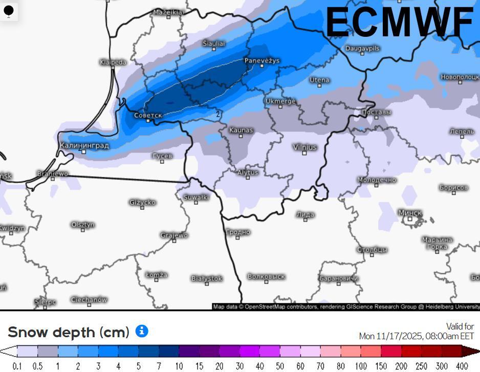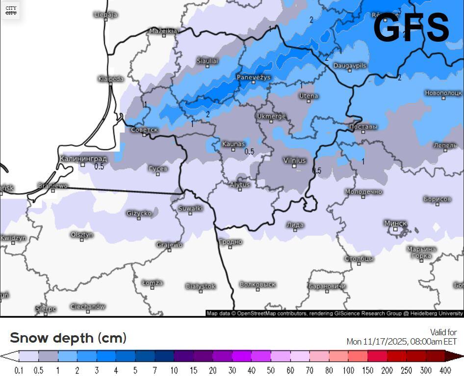 „Su pirmuoju sniegu jau galima sveikinti ir likusią Lietuvos dalį. Naujausi skaičiavimai rodo, jog per naktį iki pirmadienio ryto vietomis gali susidaryti iki keleto centimetrų storio sniego danga. Apibendrinus skirtingų orų modelių naujausius skaičiavimus, prognozuojama iki 2–5 cm. Daugiausia prisnigti turėtų maždaug ties linija Tauragė-Raseiniai-Panevėžys-Rokiškis. Būkite atidūs keliuose ir neskubėkite“, – mokslo svetainėje „Orai ir klimatas Lietuvoje“ rašė meteorologas Gytis Valaika.