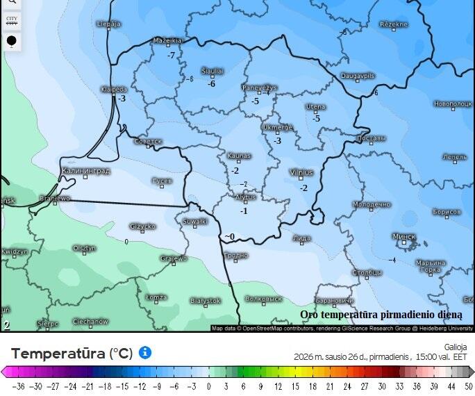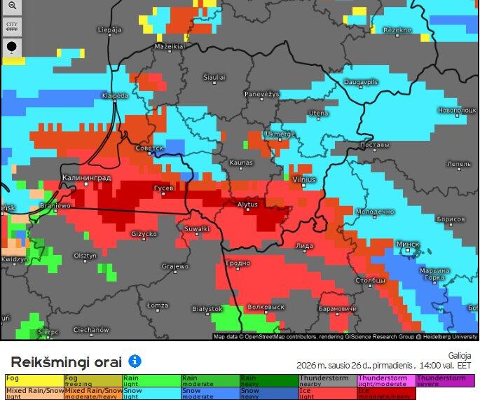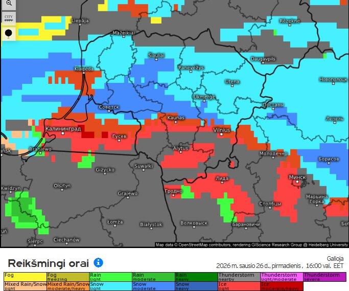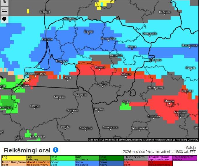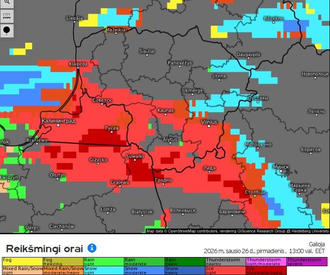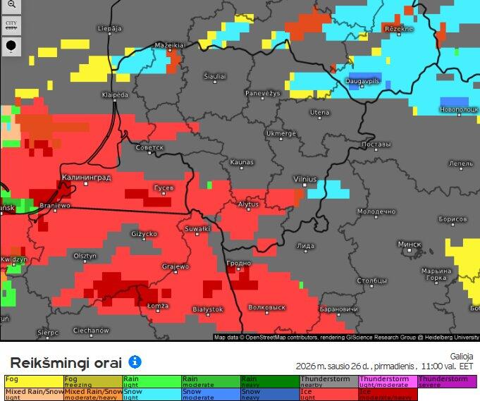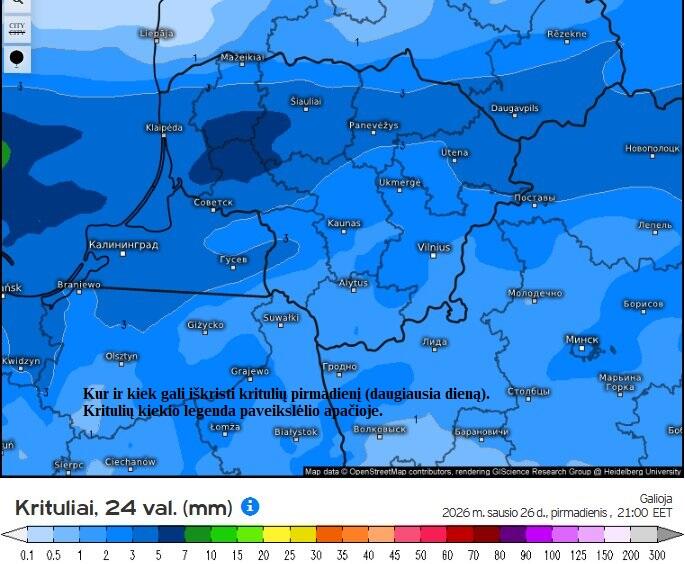 Pirmadienį, sausio 26-osios dieną, gausesni mišrūs krituliai, ypač įdienojus šiaurės vakarinėje ir šiaurinėje Lietuvos pusėje vyraus sniegas, pietvakariniuose, pietiniuose, pietrytiniuose rajonuose nedidelis sniegas su šlapdriba maišysis, dulksna, rūkai drieksis. Dieną lijundra turėtų plėstis vis toliau per Lietuvą, labiausia slidu turėtų būti pietvakarinėje, vidurio ir pietų Lietuvoje. Vėjas naktį rytų, pietryčių, dieną rytų, šiaurės rytų 7–12 m/s, dieną kai kur gūsiai iki 14 m/s. Nakties pradžioje 8–13 laipsnių šalčio, šiauriniuose rajonuose iki 14–16 laipsnių gali šalti, paryčiais ir dieną 1–6 laipsniai šalčio, šalčiausia šiauriniuose rajonuose, o pietiniam pakraštuke apie 0–1 laipsnį šilumos.