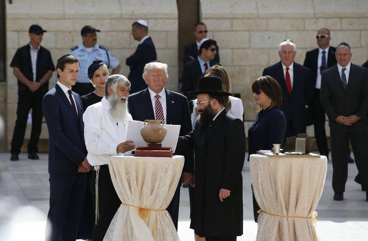 Vakarų siena yra švenčiausia žydų maldos vieta. Prie sienos D.Trumpas pozavo fotografams užsidėjęs juodą žydišką šlikę, o paskui, kaip daro daugelis čia apsilankiusiųjų, tarp jos akmenų įspraudė raštelį su savo malda.