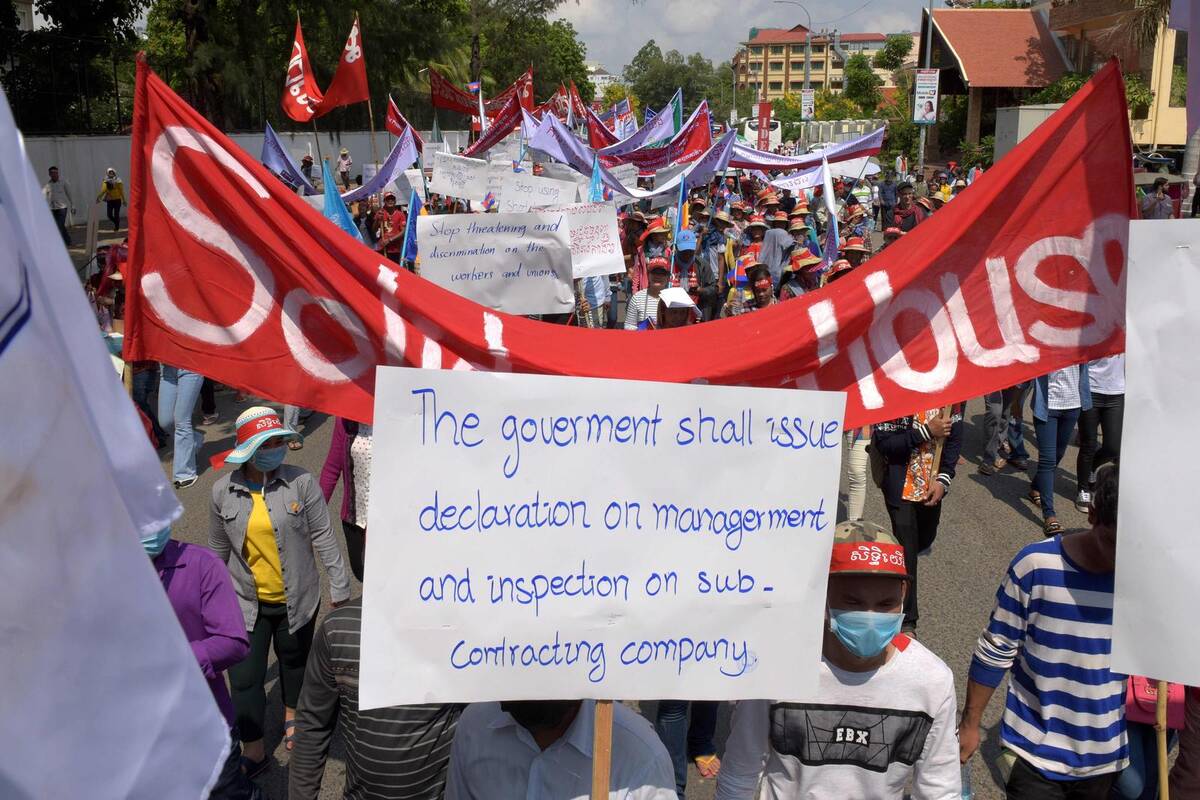 Riaušių policija atidžiai stebėjo daugiau kaip tūkstančio tekstilės įmonių darbininkų demonstraciją, per kurią protestuota prieš vyriausybės draudimą rengti eitynes. Jų surašyta peticija buvo perduota Nacionalinei asamblėjai Pnom Penyje. Darbininkai reikalauja pakelti minimalų atlyginimą ir užtikrinti didesnę susirinkimų laisvę.