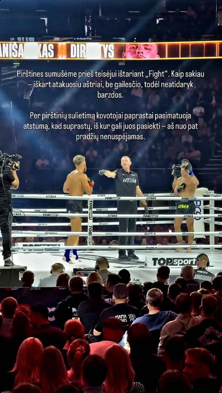 „Pirštines sumušėme prieš teisėjui ištariant „Fight“. Kaip ir sakiau – iškart atakuosiu aštriai, be gailesčio, todėl neatidaryk barzdos. Per pirštinių sulietimą kovotojai paprastai pasimatuoja atstumą, kad suprastų, iš kur gali juos pasiekti – aš nuo pat pradžių nenuspėjamas“, – socialinio tinklo „Instagram“ istorijoje rašė D. Dirkstys.