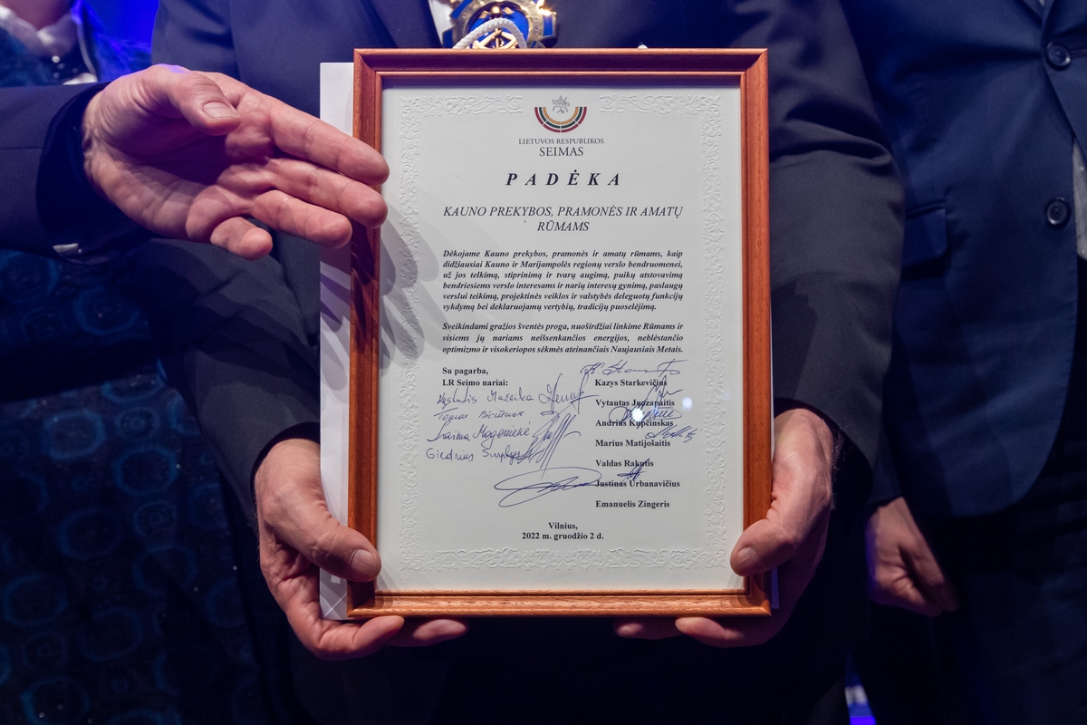 Šiemet verslo bendruomenė turėjo nemažai progų prisistatyti tarptautinėse parodose, verslo misijose. Į šventinį vakarą gausiai susirinkusi Kauno verslo bendruomenė išliko vieninga, susitelkusi ir sunkiu metu renkant paramą Ukrainai, todėl metinio renginio metu buvo padėkota visiems geradariams, kurie nenuleido rankų ir svariai prisidėjo tiek suteikiant darbo vietas, tiek telkiant paramą tiems, kam dabar jos labai reikia.
