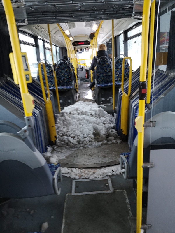 Redakcijai atsiųstose nuotraukose matyti, 1G numeriu pažymėto autobuso salonas, kurio viduryje suverstas nemenko storio sniego sluoksnis. Keleivių čia nedaug, tačiau ir tie, kurie yra, sėdi arba stovi kiek tolėliau nuo klampios vietos.