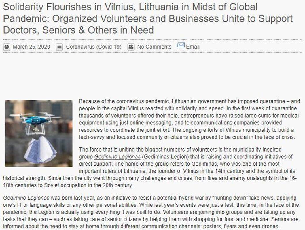 Vieno didžiausių Naujosios Zelandijos laikraščio „New Zealand Herald“ interneto portalas pranešė, kad jau pirmąją karantino savaitę Vilniuje atsirado tūkstančiai savanorių, pasiruošusių pagelbėti vyresniems miestiečiams, medikams ir kitokiais būdais padėti miestui kovoti su pandemija. Kelionių profesionalų naujienų portalas „Travel Weekly“ rašė apie tai, kad Vilniuje svarbiai karantino informacijai skleisti pasitelkiami dronai.