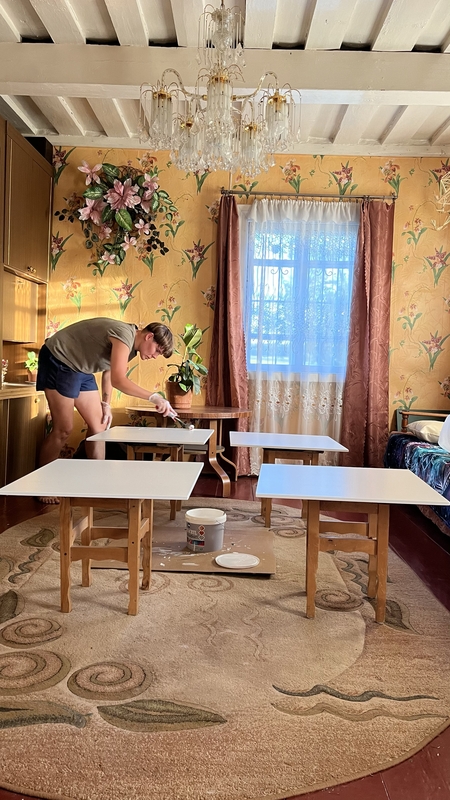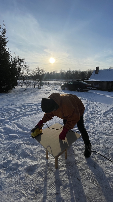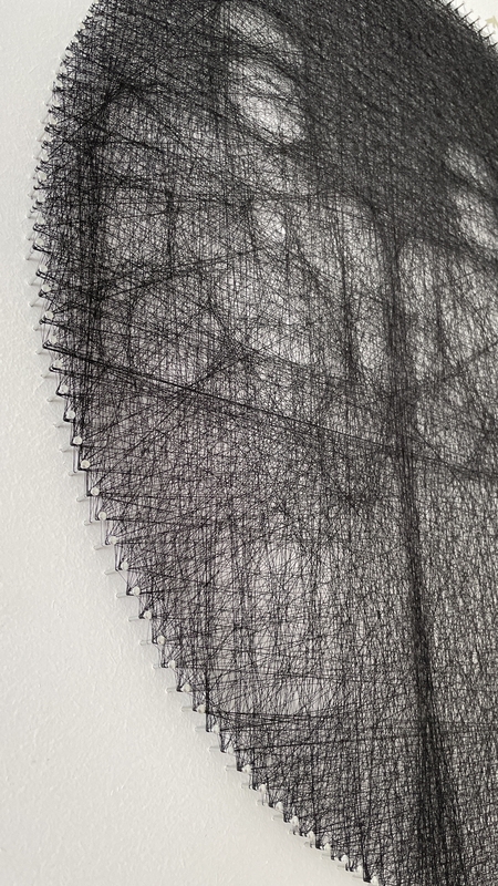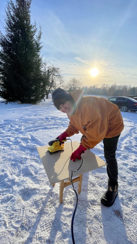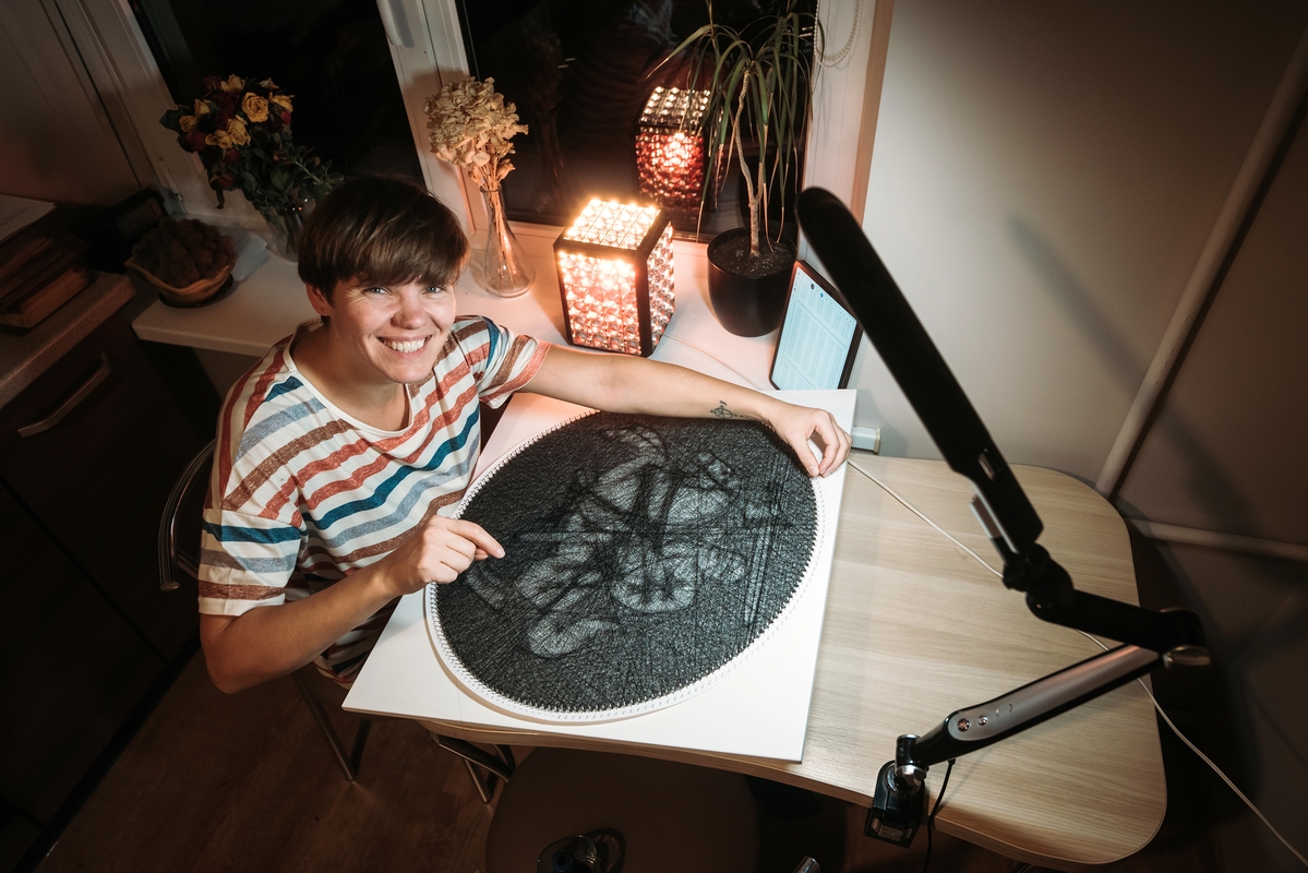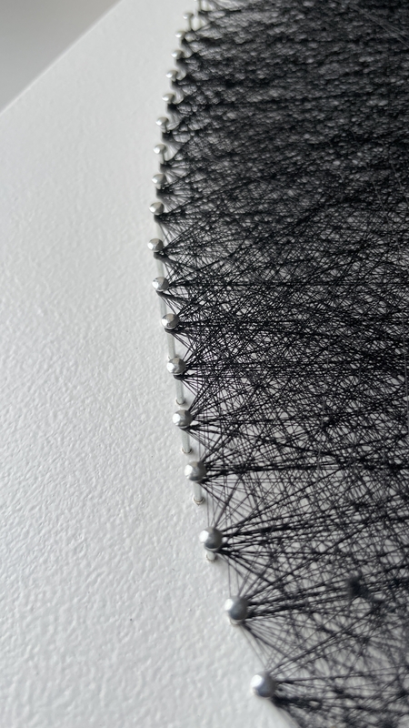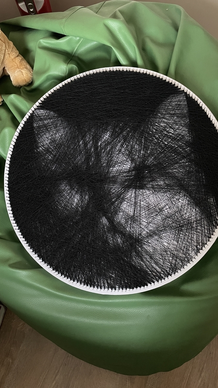 Pasirengimas: lentas reikia nušlifuoti, paruošti dažyti, tada keliais sluoksniais nudažyti. Galiausiai – ratu sukalti 200 vinukų, už kurių vėliau kabinami siūlai. / V. Jurevičiaus, „Kačių kavinės“, K. Moisejenko ir I. Stankevič asmeninio archyvo nuotr.