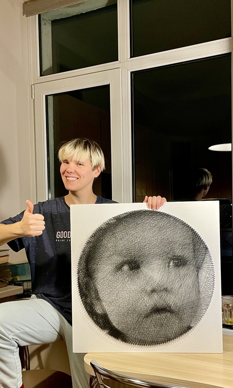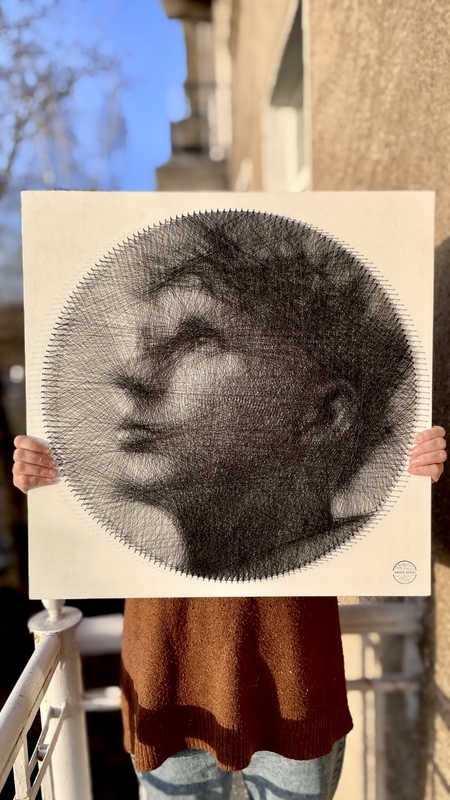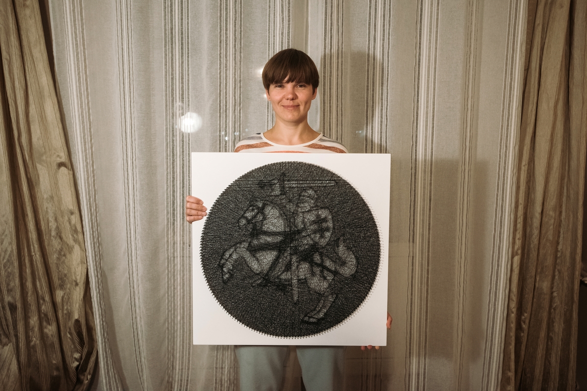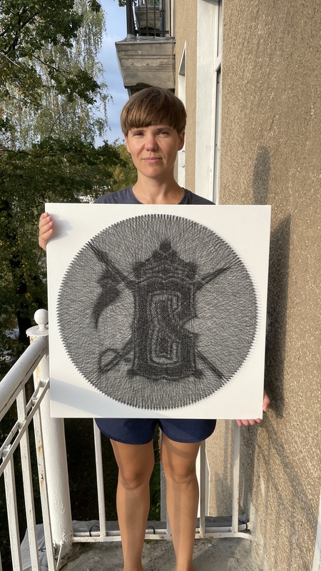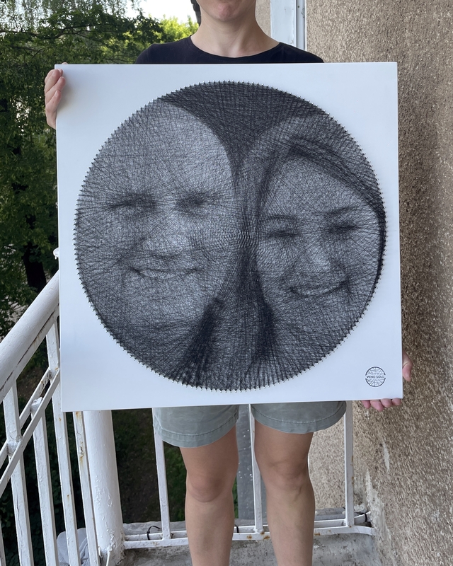 Pasiruošusi schemą, ją perduoda Inesai, o ši pagal ją siūlu rankomis raizgo paveikslą. Tiesa, prieš tai dar reikia paruošti paveikslui lentą. Vienintelis dalykas, ko merginos nedaro rankomis, tai nepjauna kvadratinių lentų – jas perka. Tačiau lentas dar reikia nušlifuoti, paruošti dažyti, tada keliais sluoksniais nudažyti. Galiausiai – ratu sukalti 200 vinučių, už kurių vėliau kabinami siūlai.