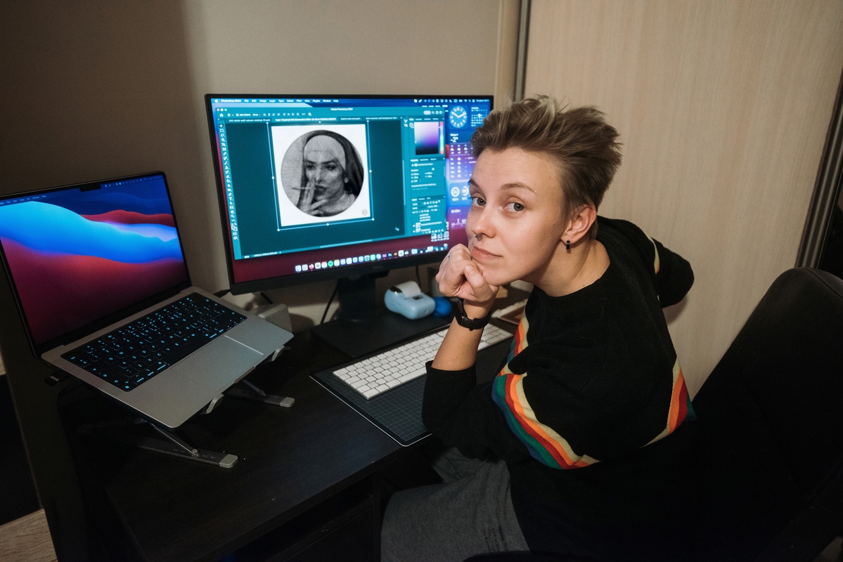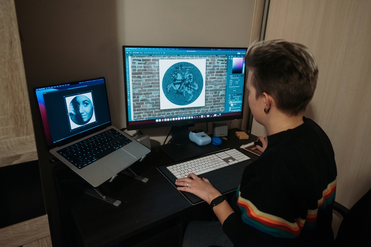 „Turėdama nuotrauką, pagal kurią norime sukurti paveikslą, aš ją fotošopu specialiai apdoroju, kad ji būtų tinkama: padidinu spalvų kontrastus, panaikinu šešėlius, nes siūlas nėra pieštukas, jis nepadarys šešėlio švelnesnio ar juodesnio. Paskui kompiuterinė programa sudaro paveikslo schemą“, – dalijasi darbo subtilybėmis Kristina.