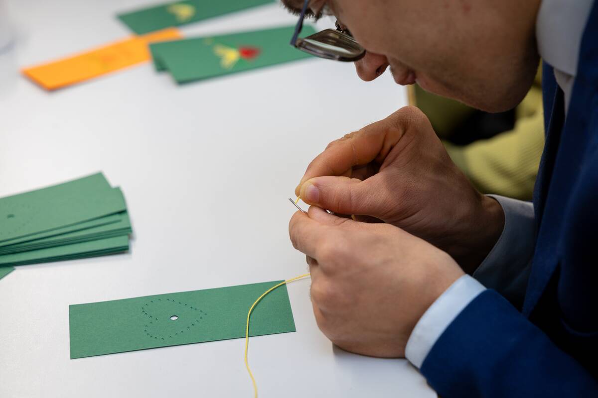 Žmonių su intelekto negalia darbas – perlenkti, suskaičiuoti ir tvarkingai sudėti popieriaus lapus, uždėti viršelį, viską kruopščiai susegti. Kai „Kauno diena“ lankėsi dirbtuvėse, visi dirbo prie užsakymo Užimtumo tarnybai – siuvinėjo trispalves širdeles užrašų knygelių dekoravimui.