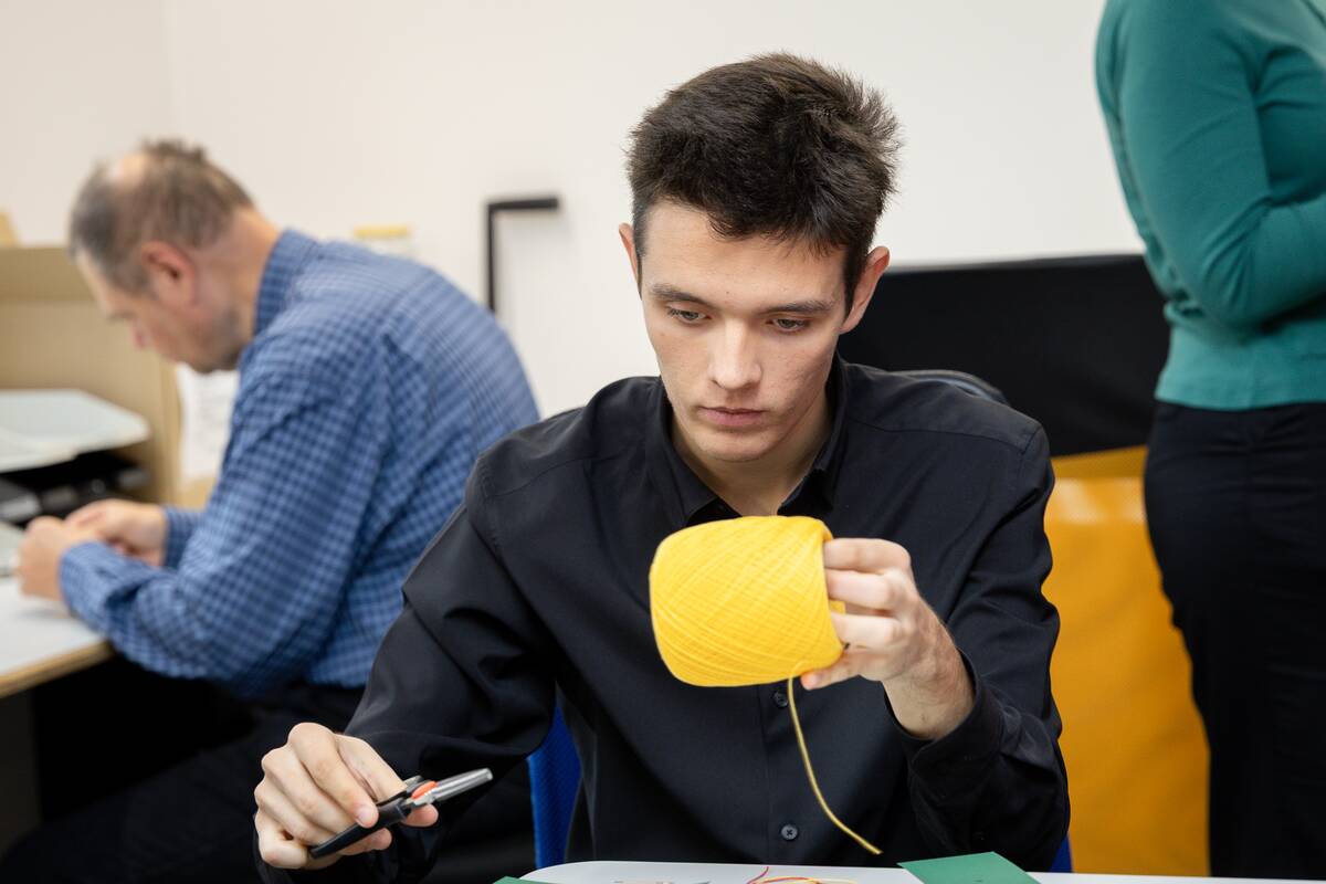 Denisas kruopščiai keitė siūlų spalvą, skaičiavo, kiek kokios spalvos dygsnių reikia padaryti. Bet tylus ir kruopštus devyniolikmetis turi svajonę – dirbti už socialinių dirbtuvių sienų ir gauti atlygį už atliktą darbą.